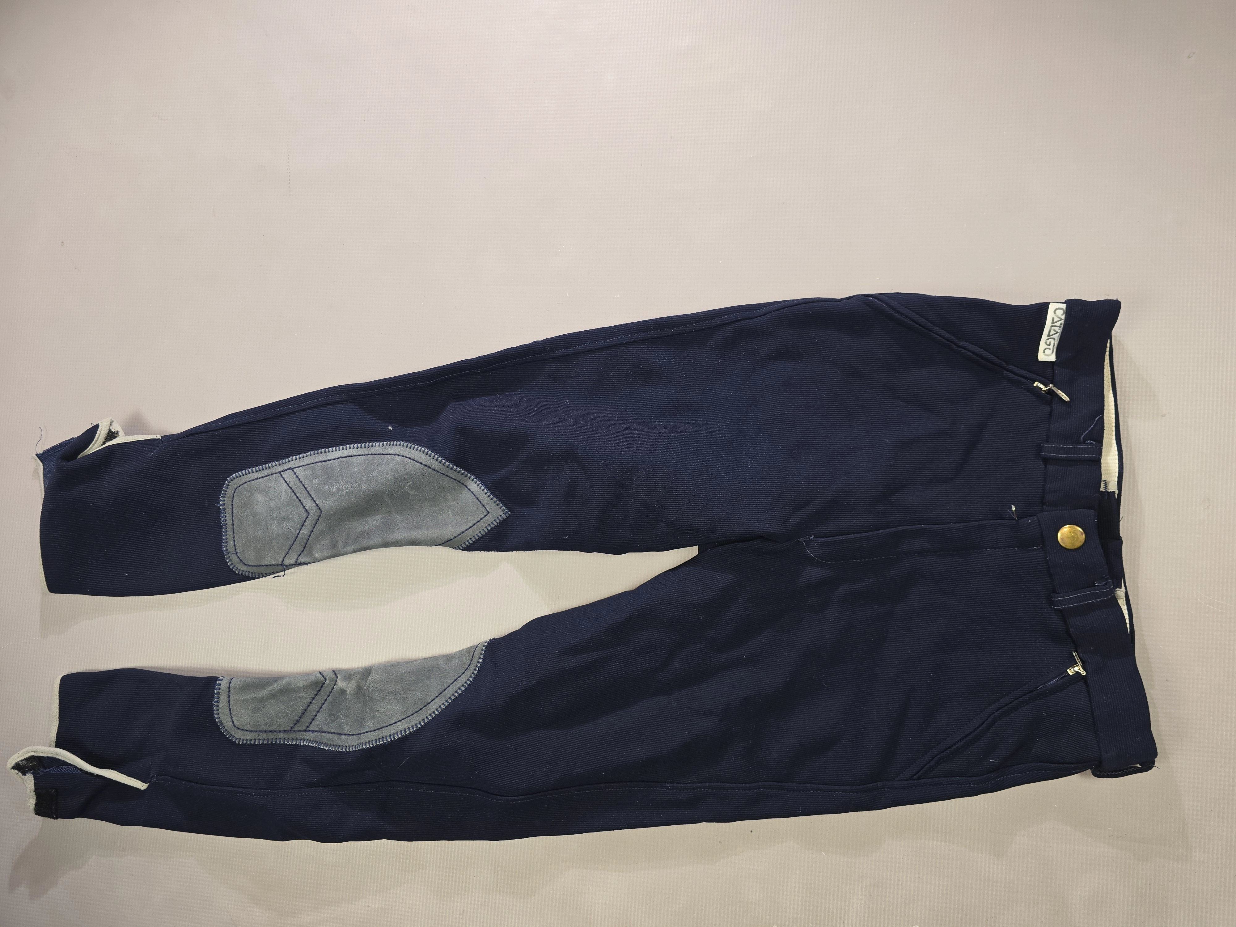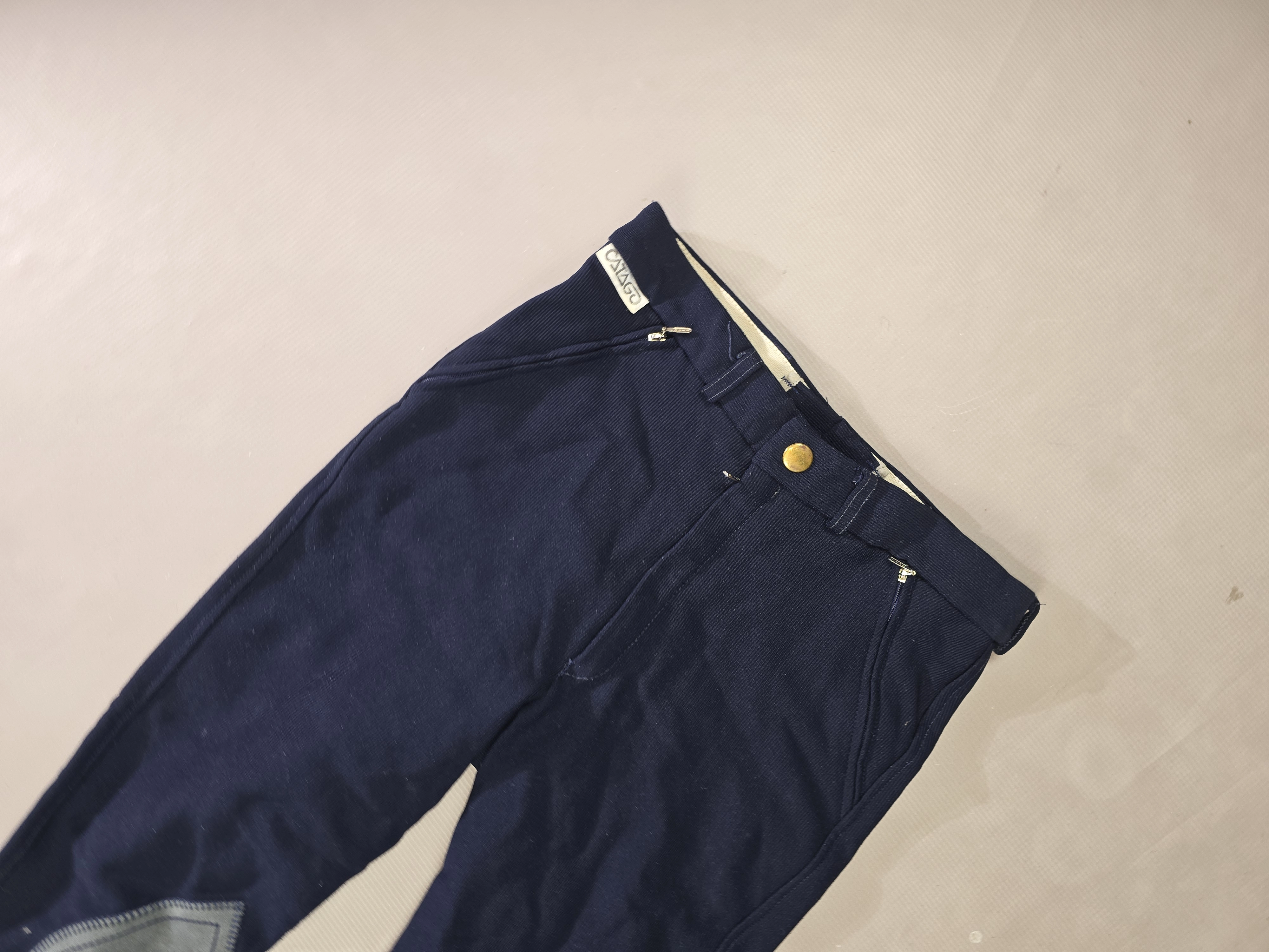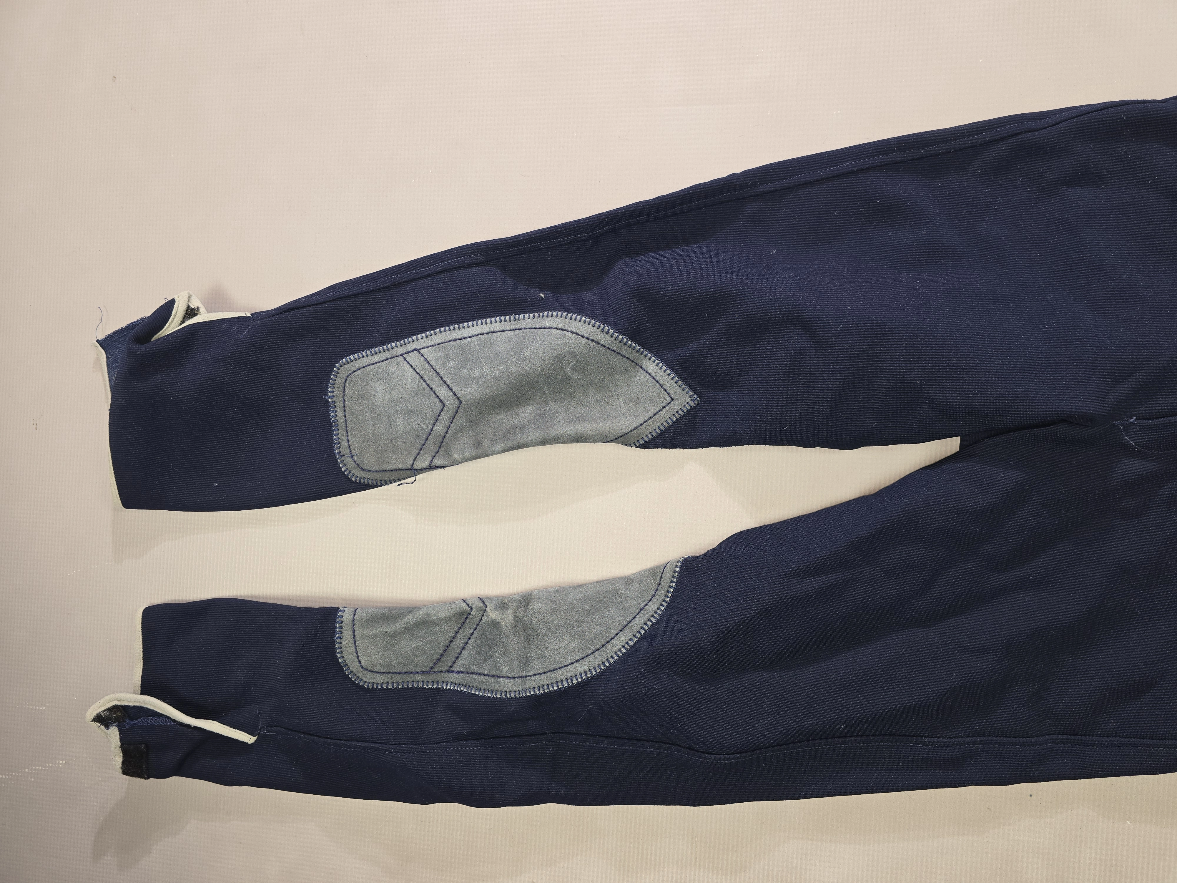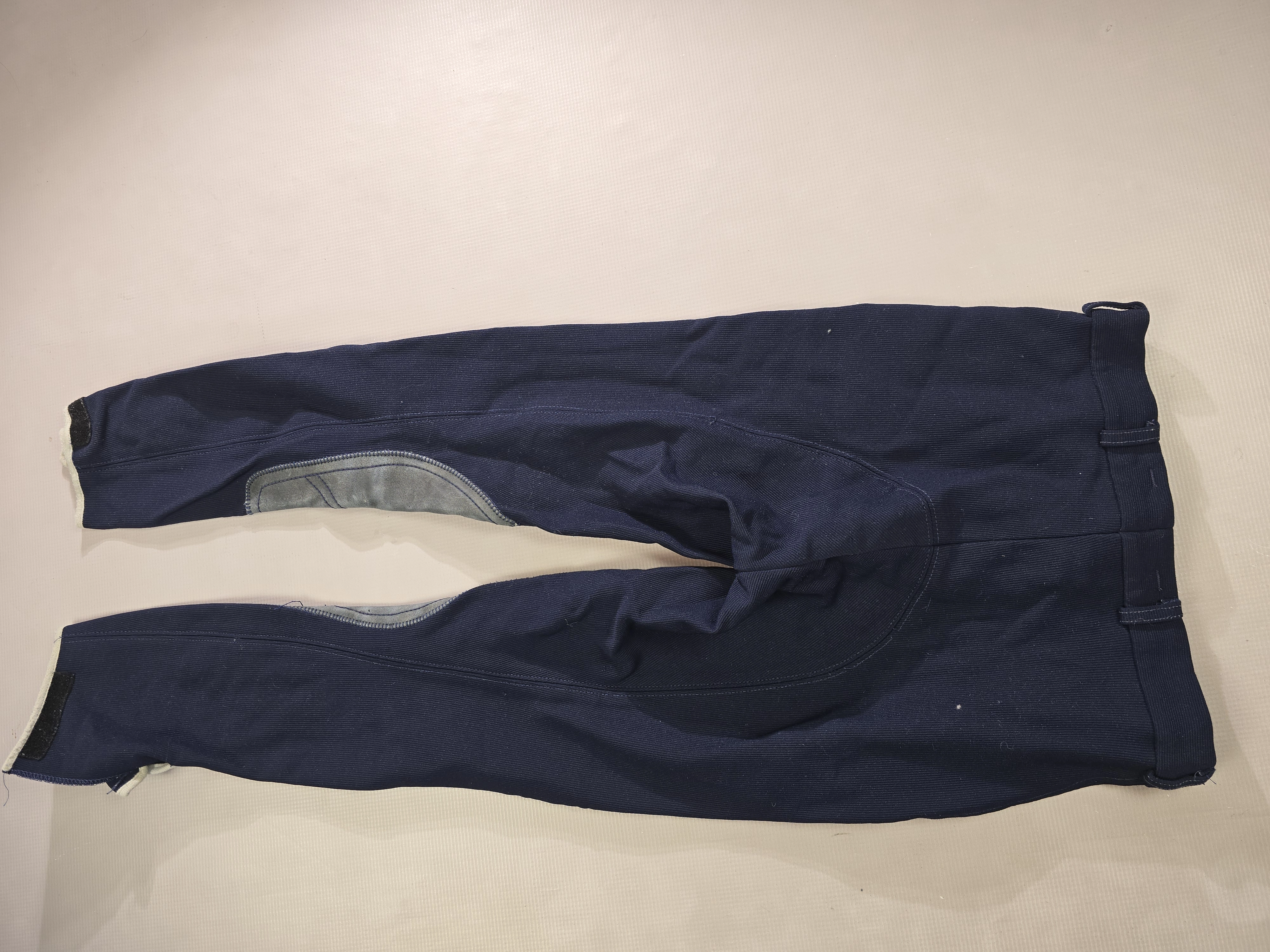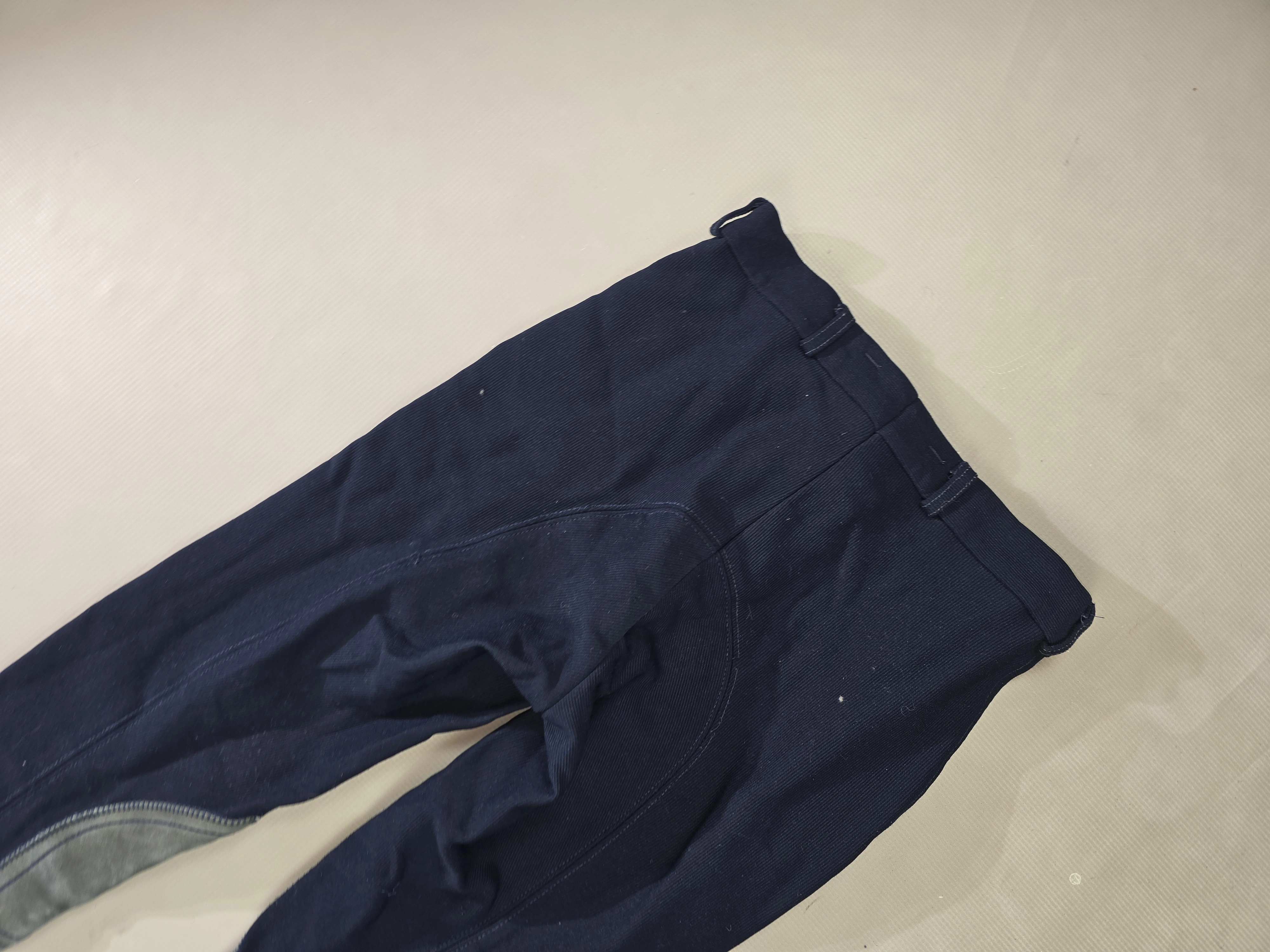 Używane bryczesy koloru granatowego. Posiadają krótki lej ze skóry.