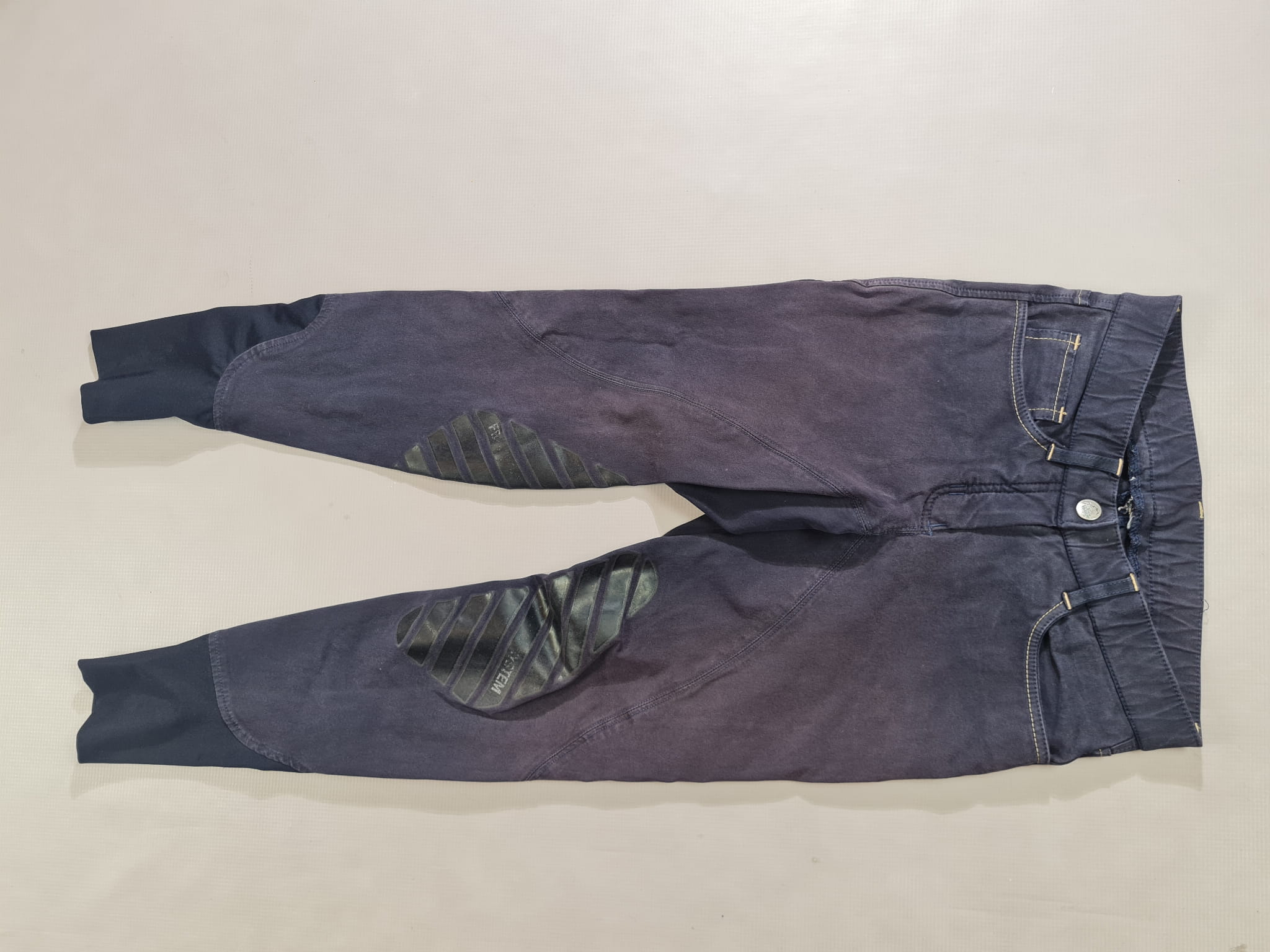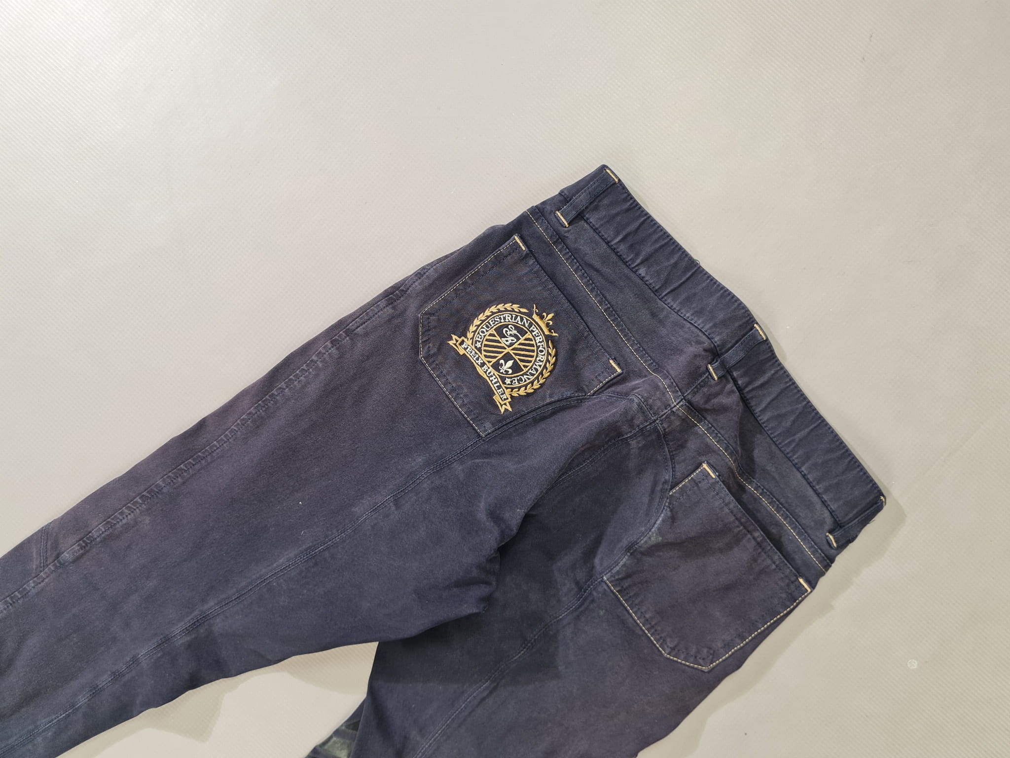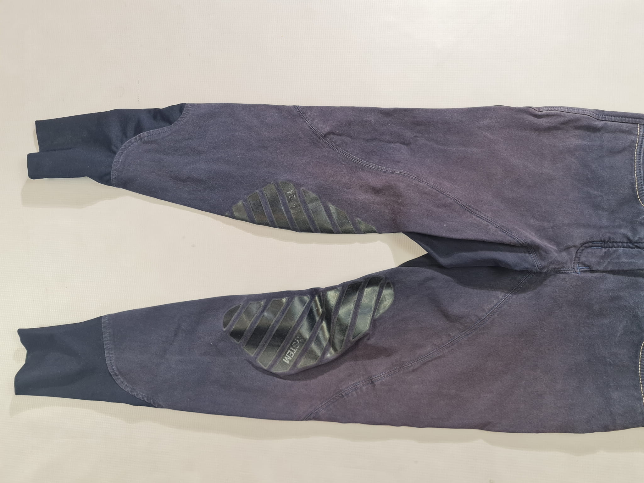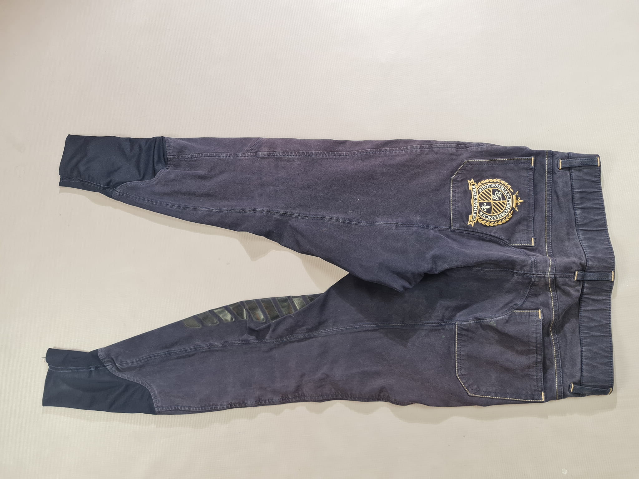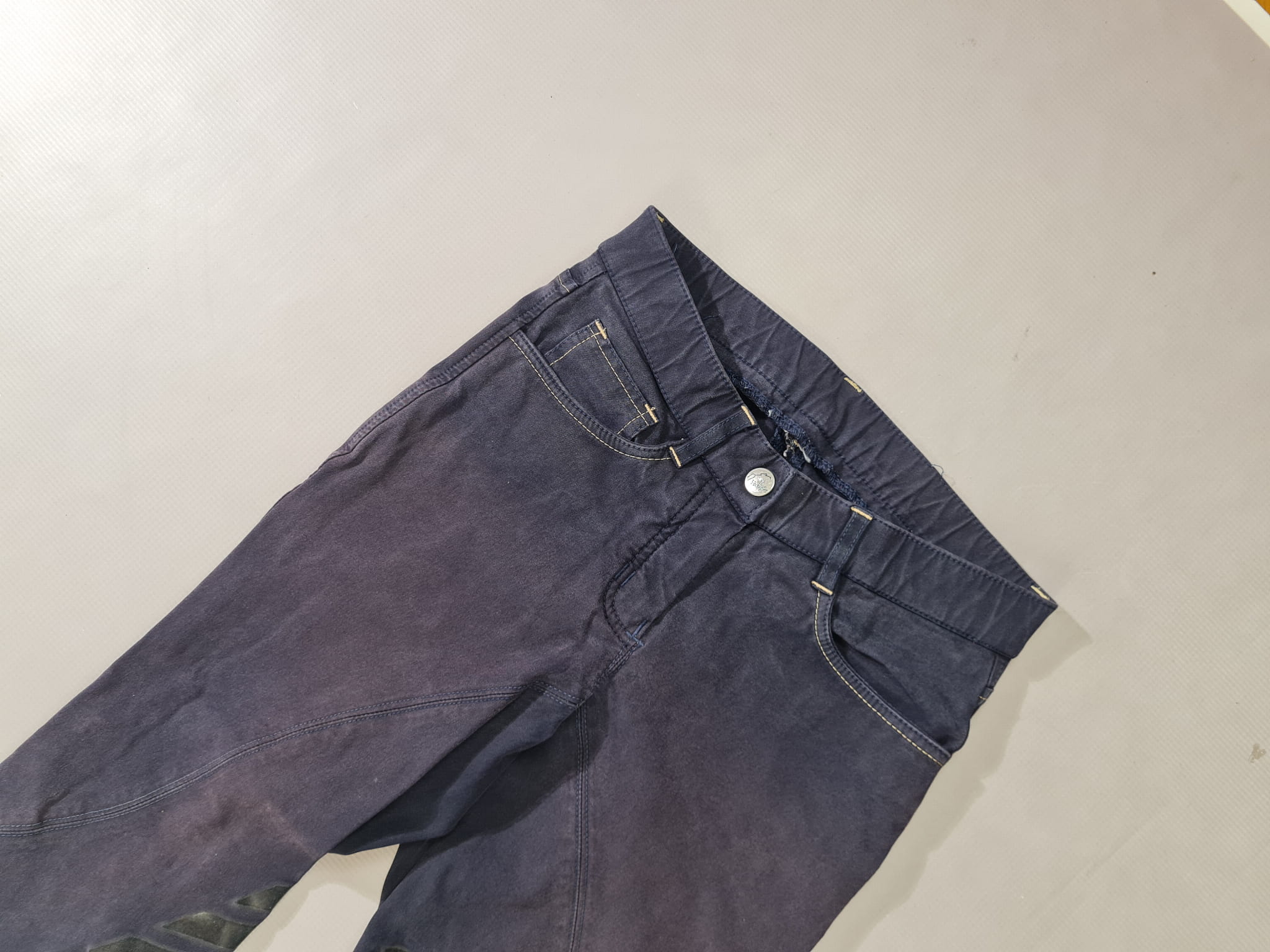 Używane bryczesy koloru granatowego. Posiadają silikonowy krótki lej.