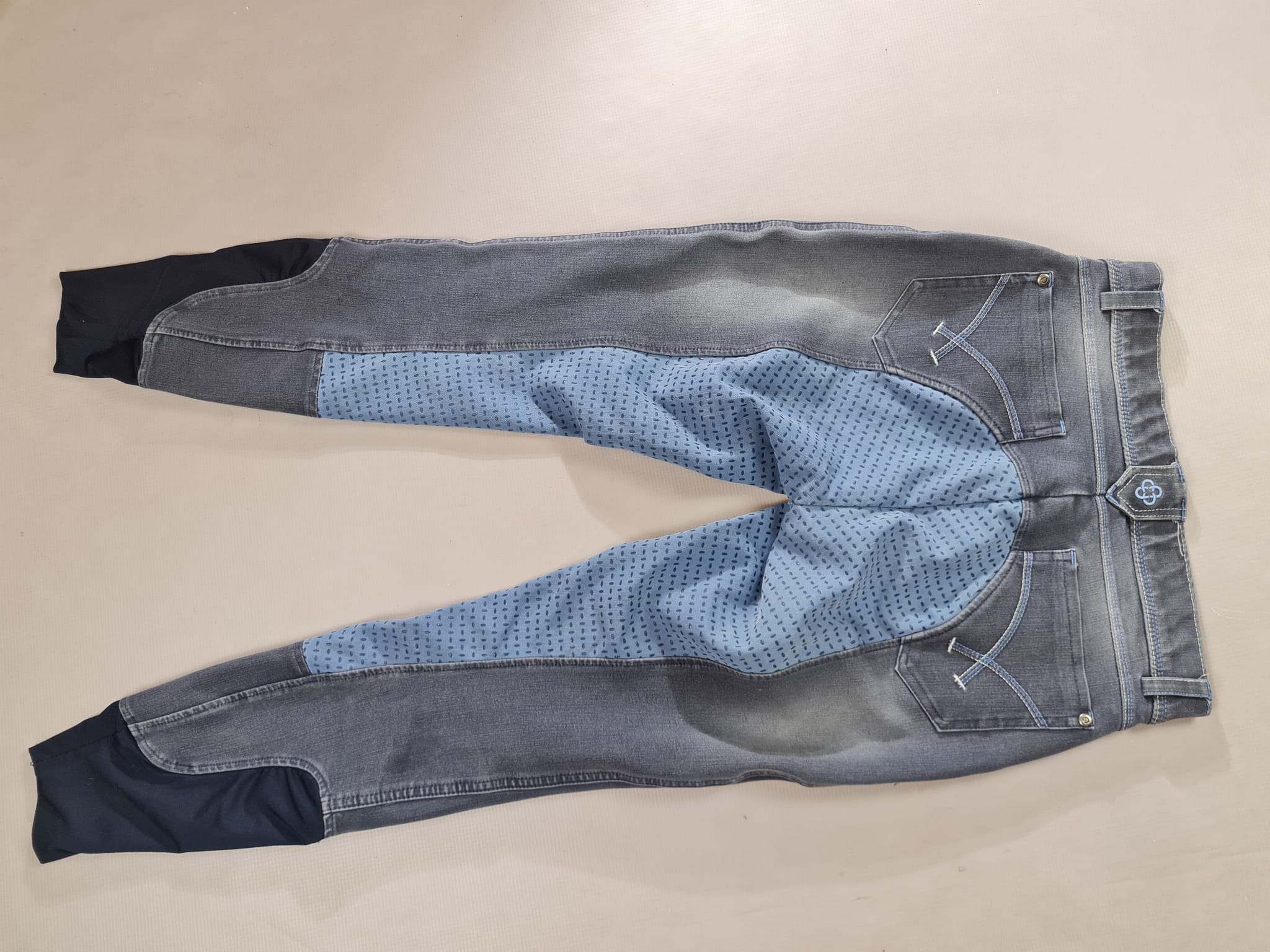 Używane bryczesy jeansowe. Posiadają silikonowy pełny lej