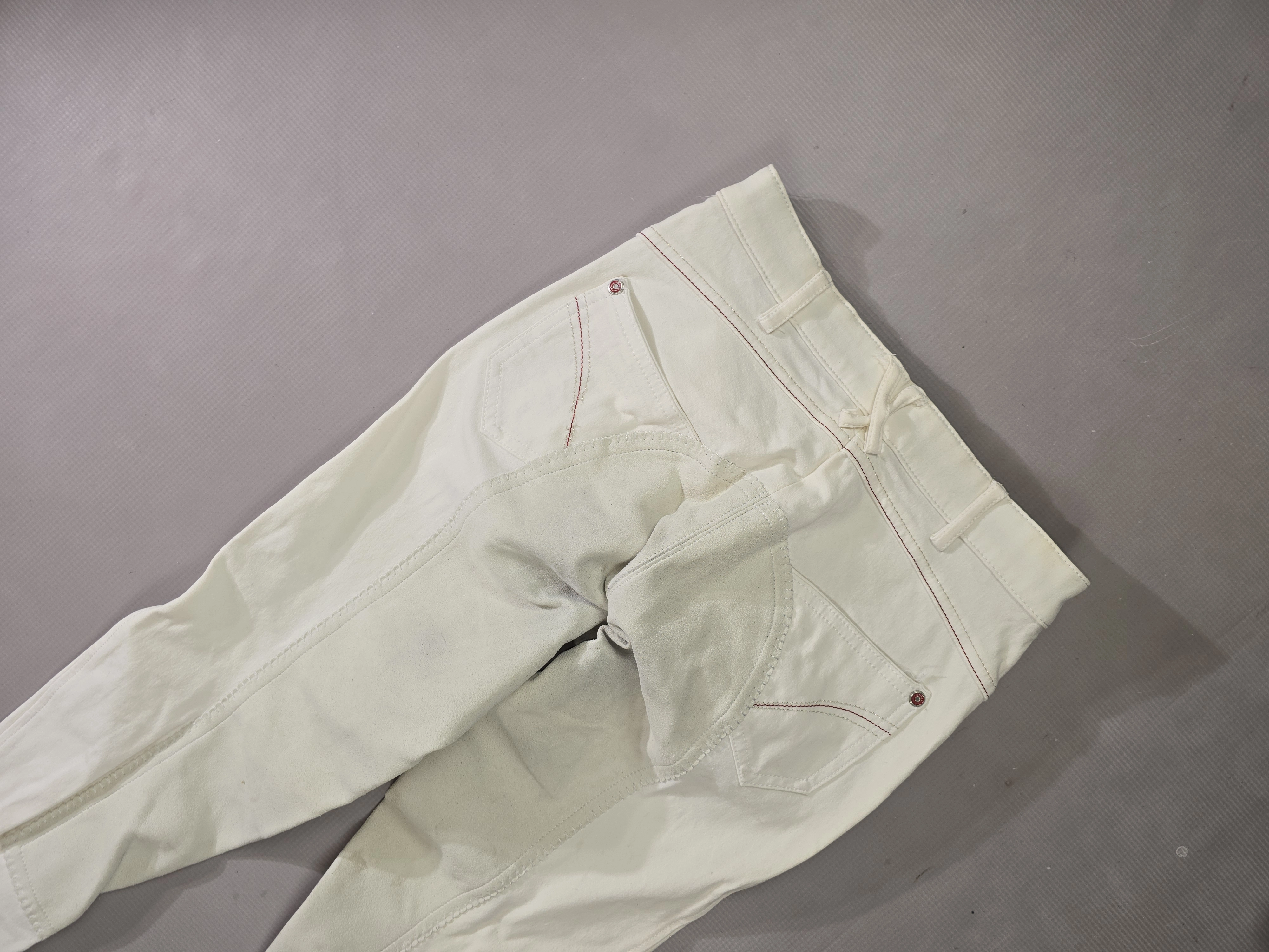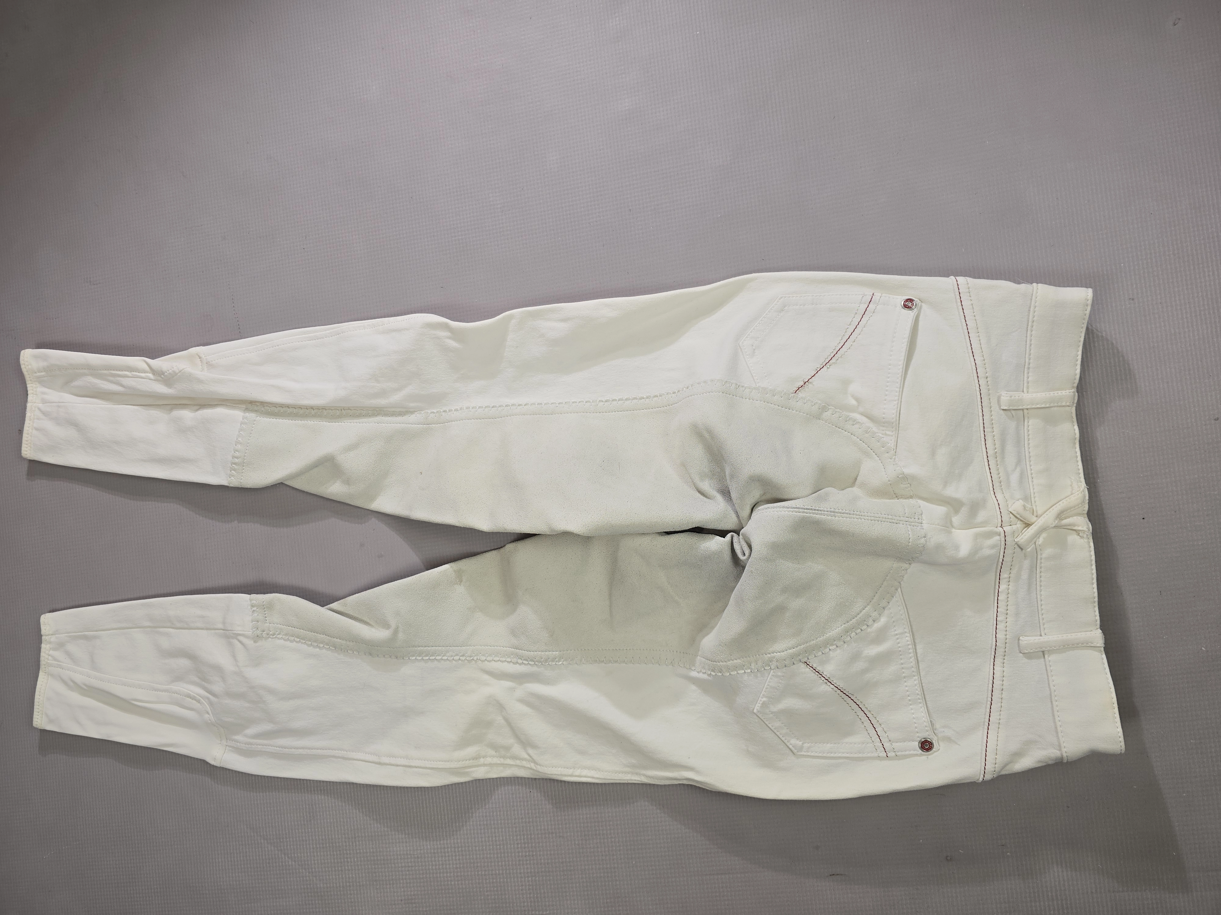 Używane bryczesy koloru białego. Posiadają skórzany pełny lej.