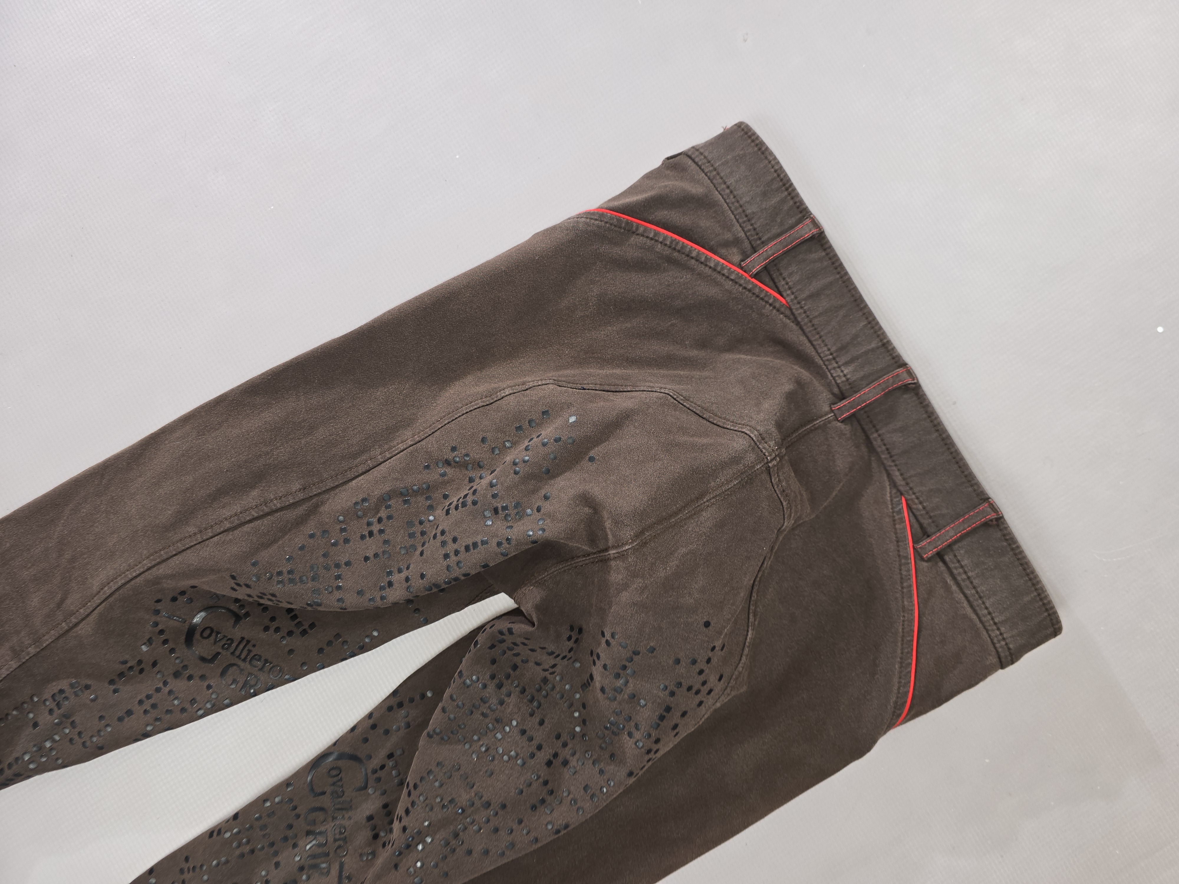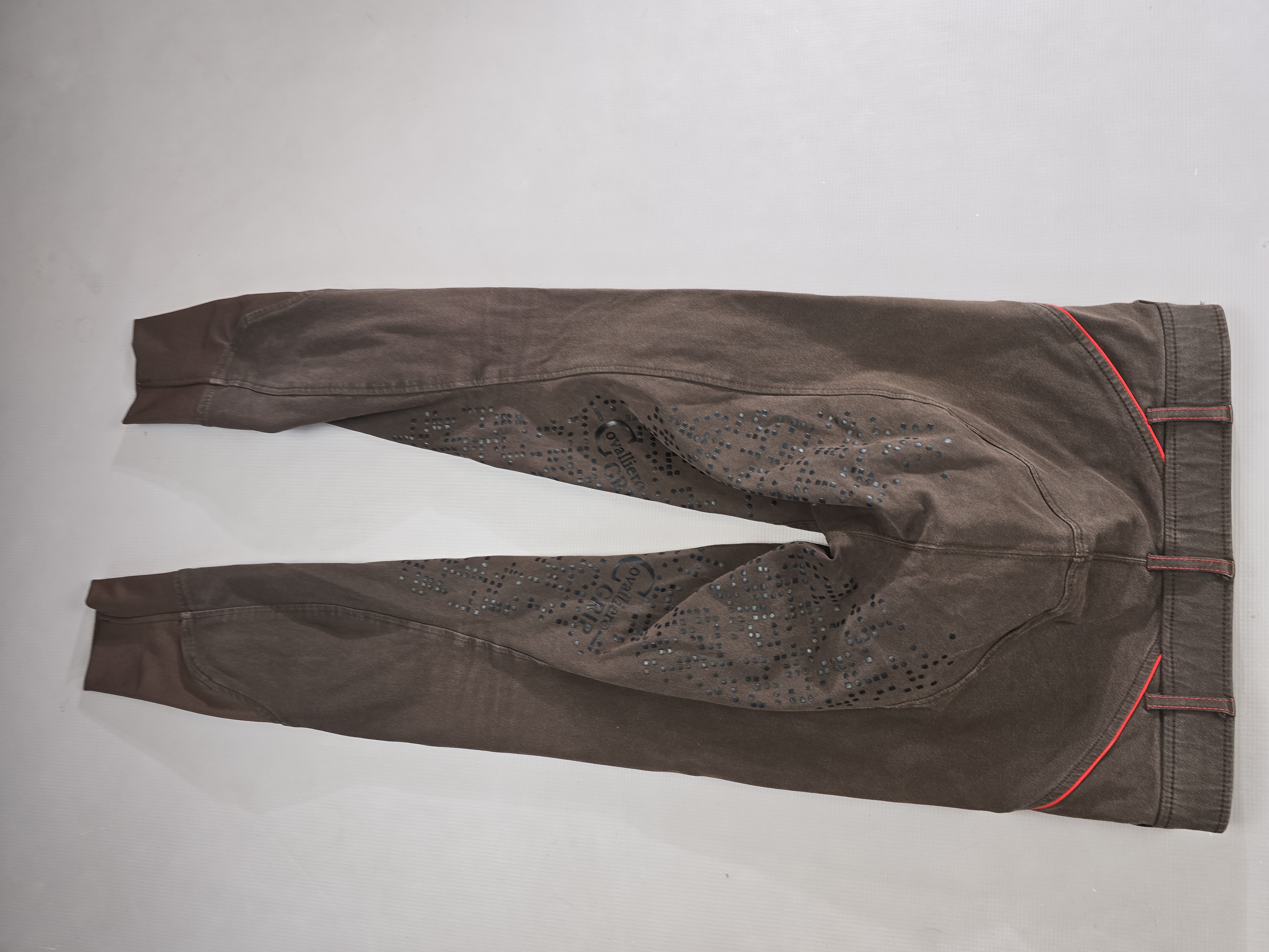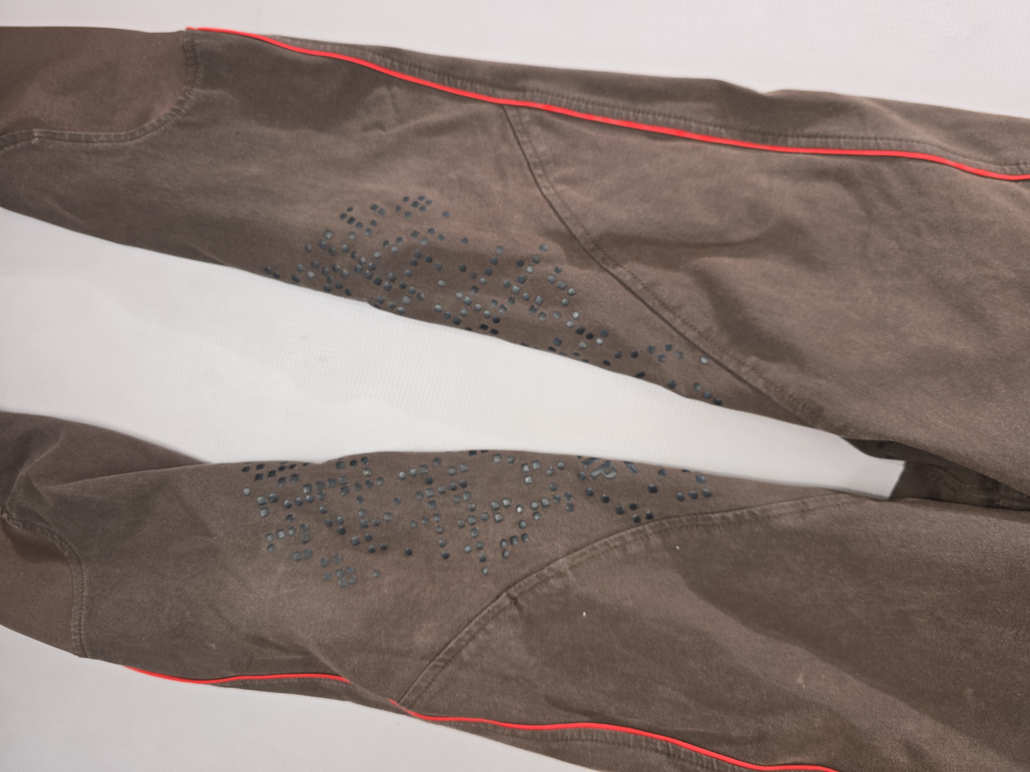Używane bryczesy koloru brązowego. Posiadają silikonowy pełny lej