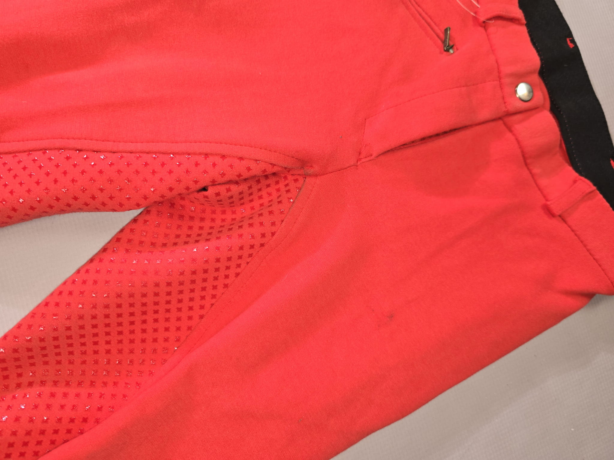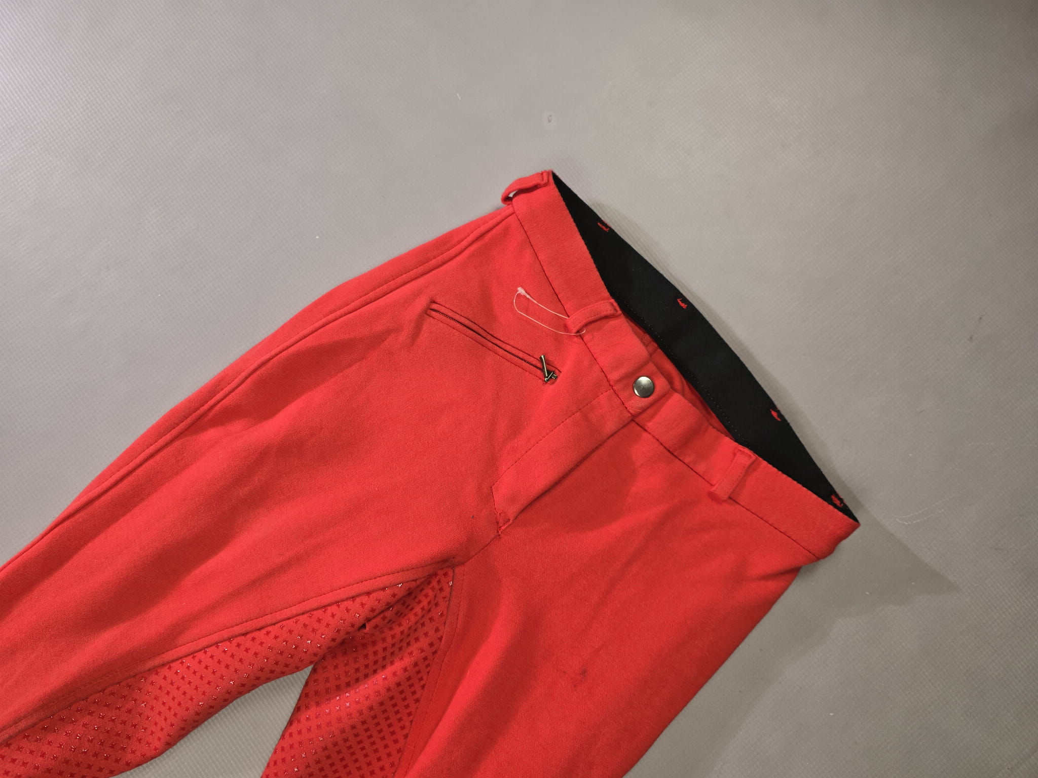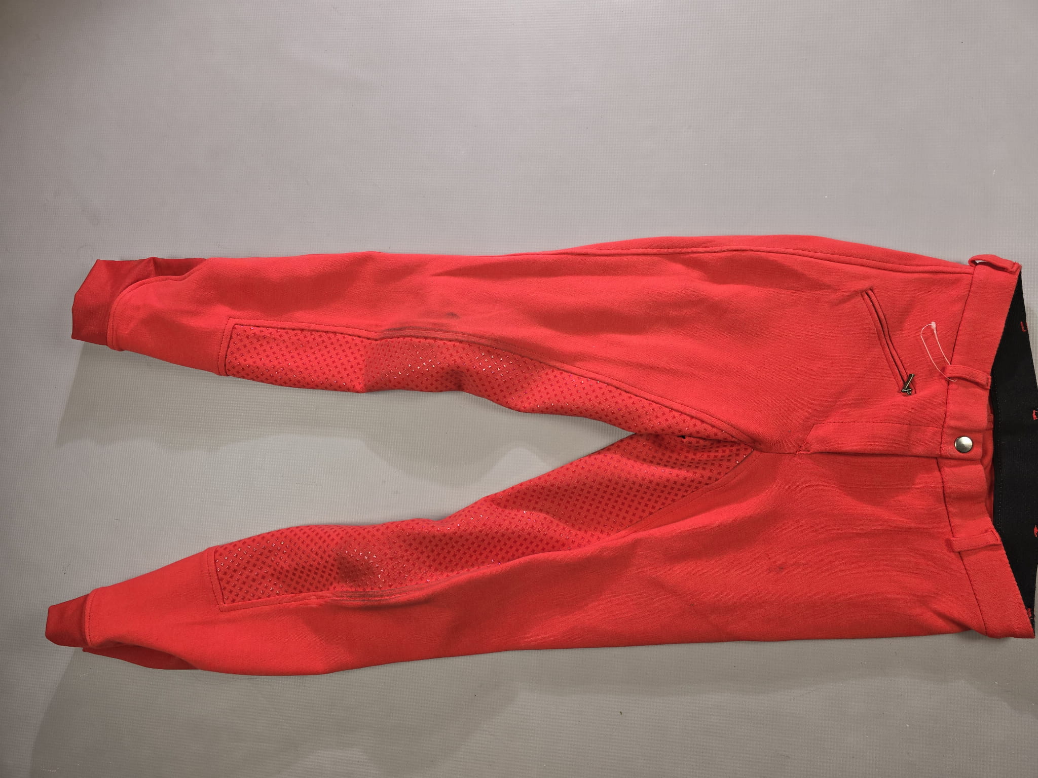 Używane bryczesy koloru czerwonego. Posiadają silikonowy pełny lej.