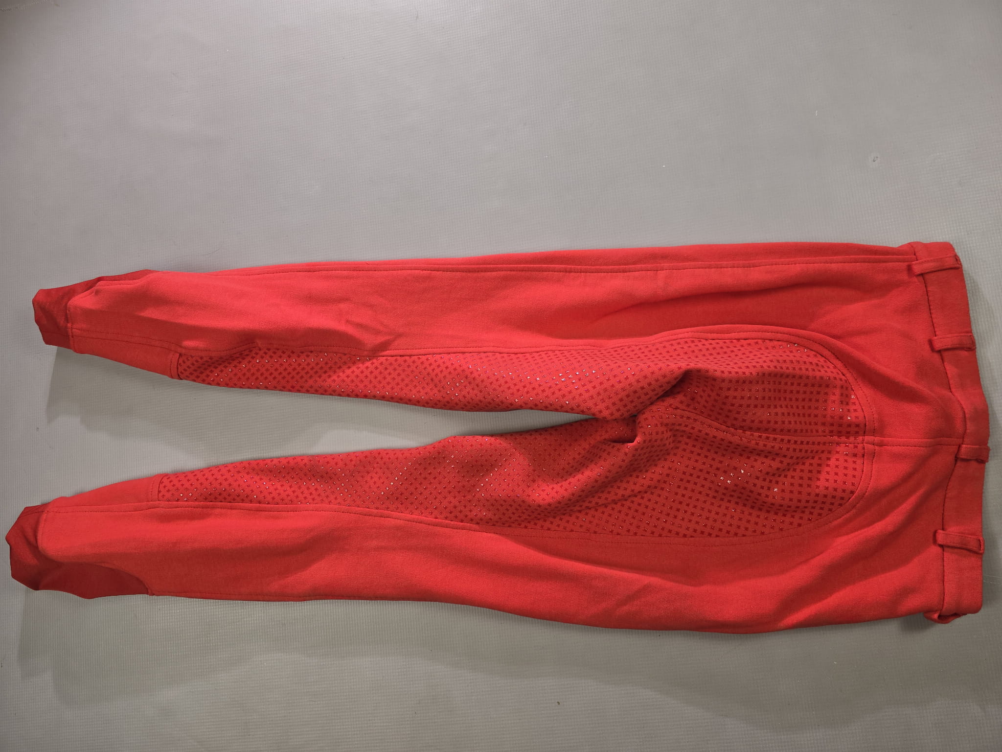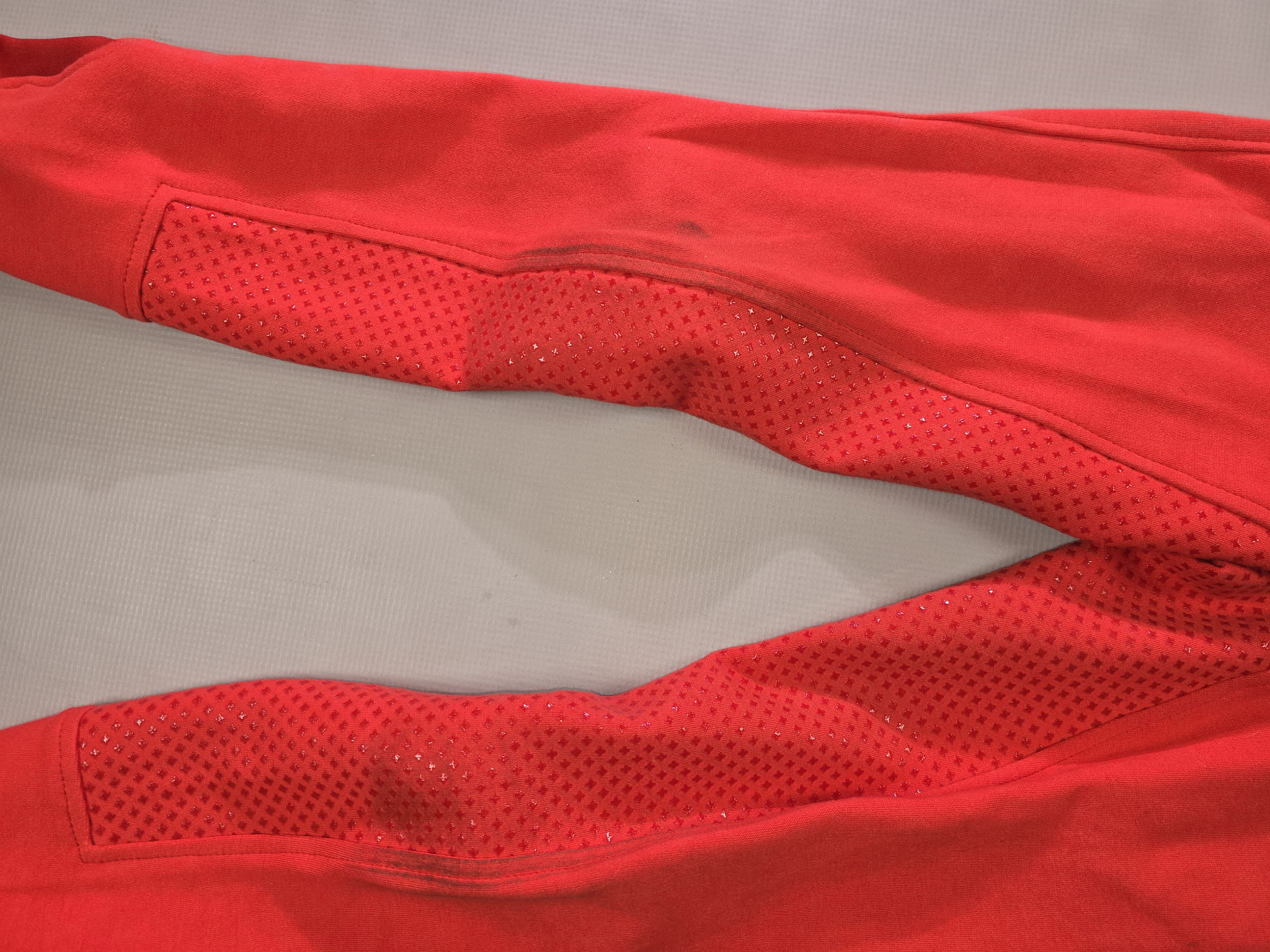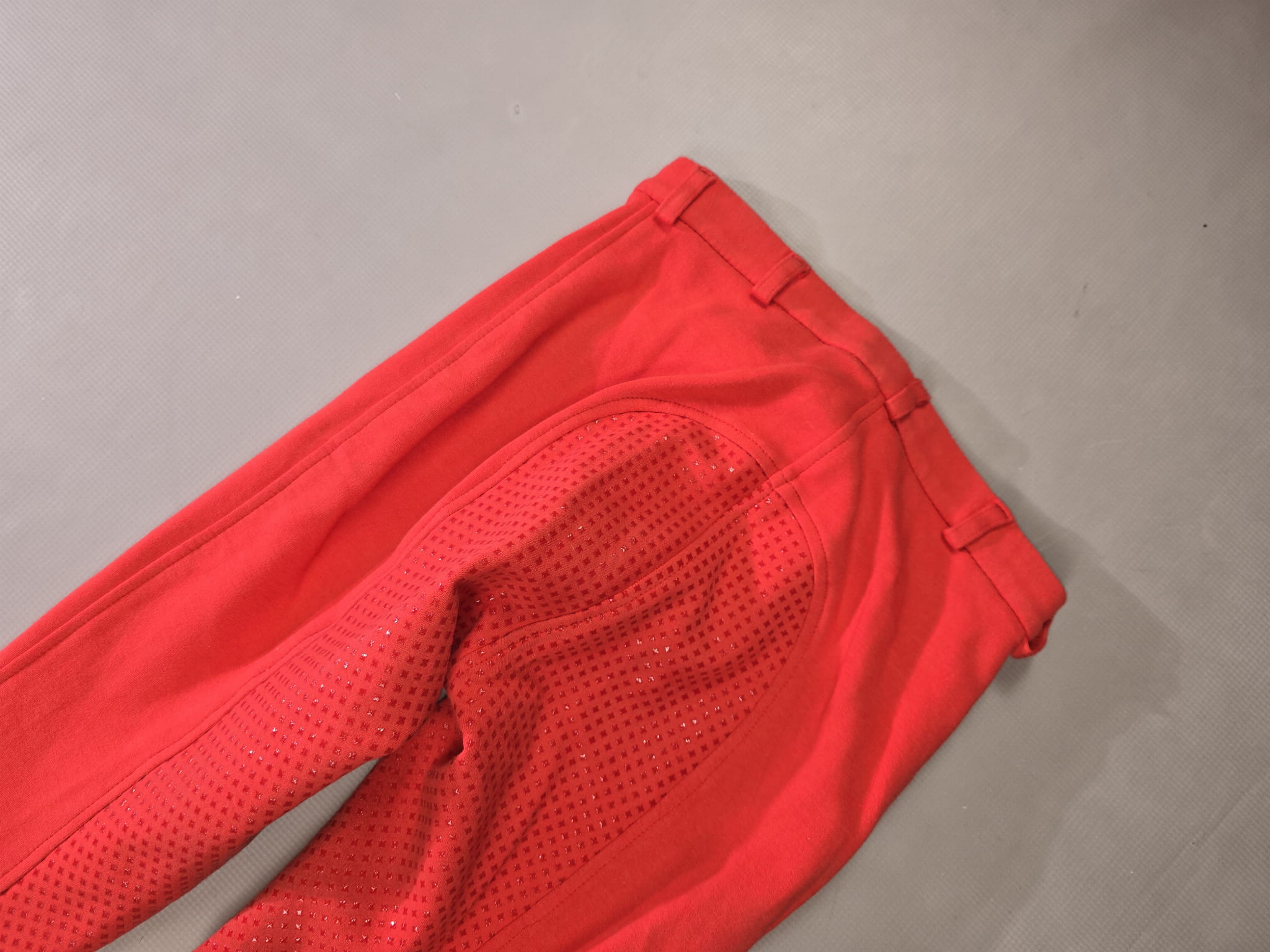 Używane bryczesy koloru czerwonego. Posiadają silikonowy pełny lej.
