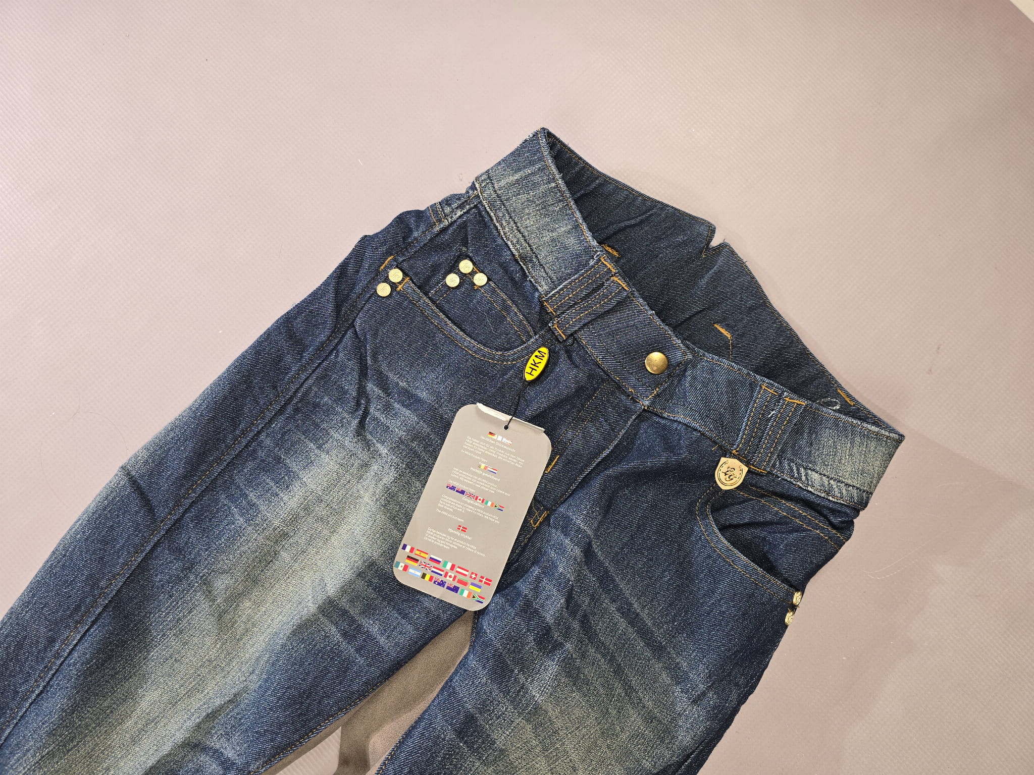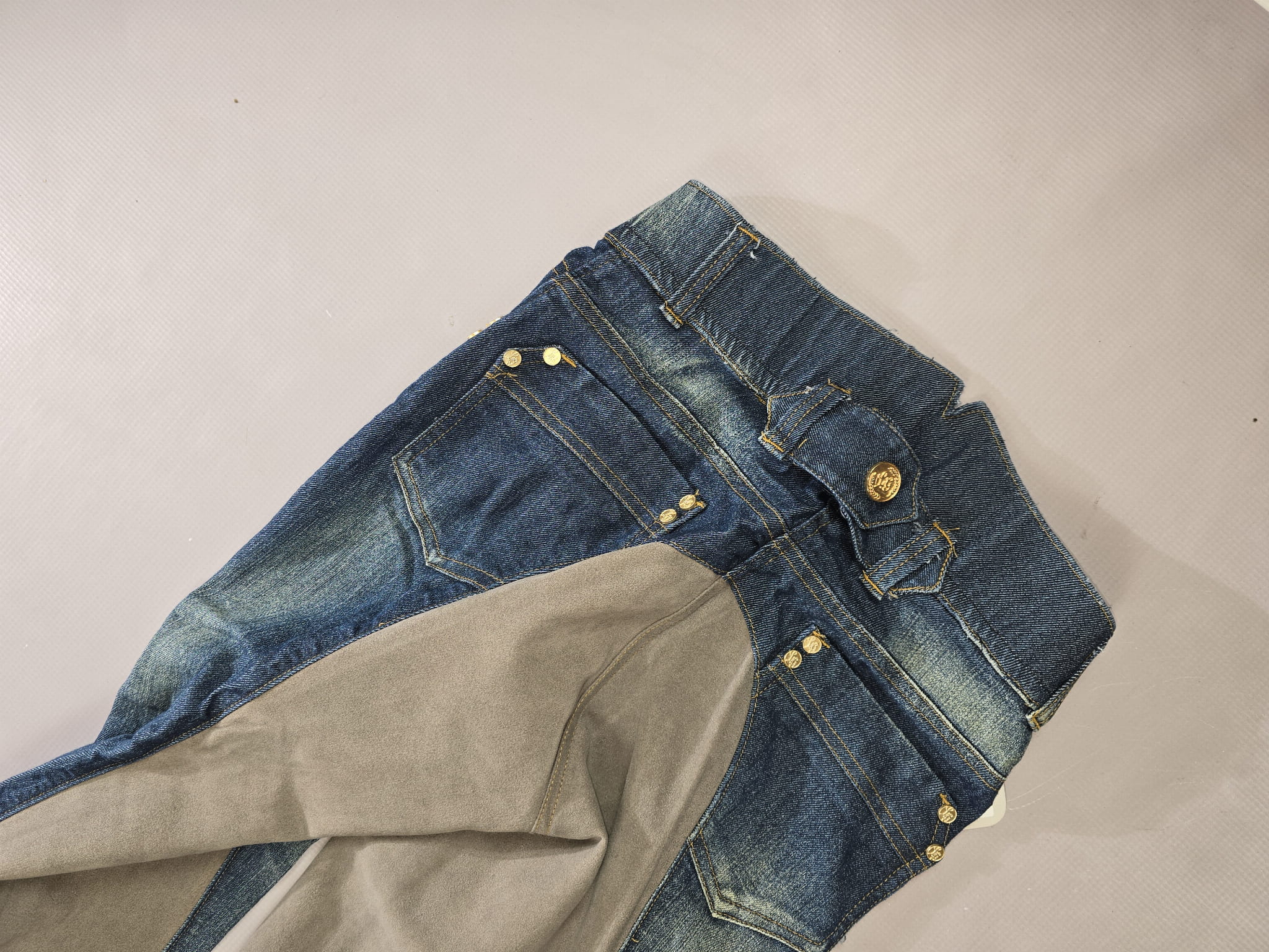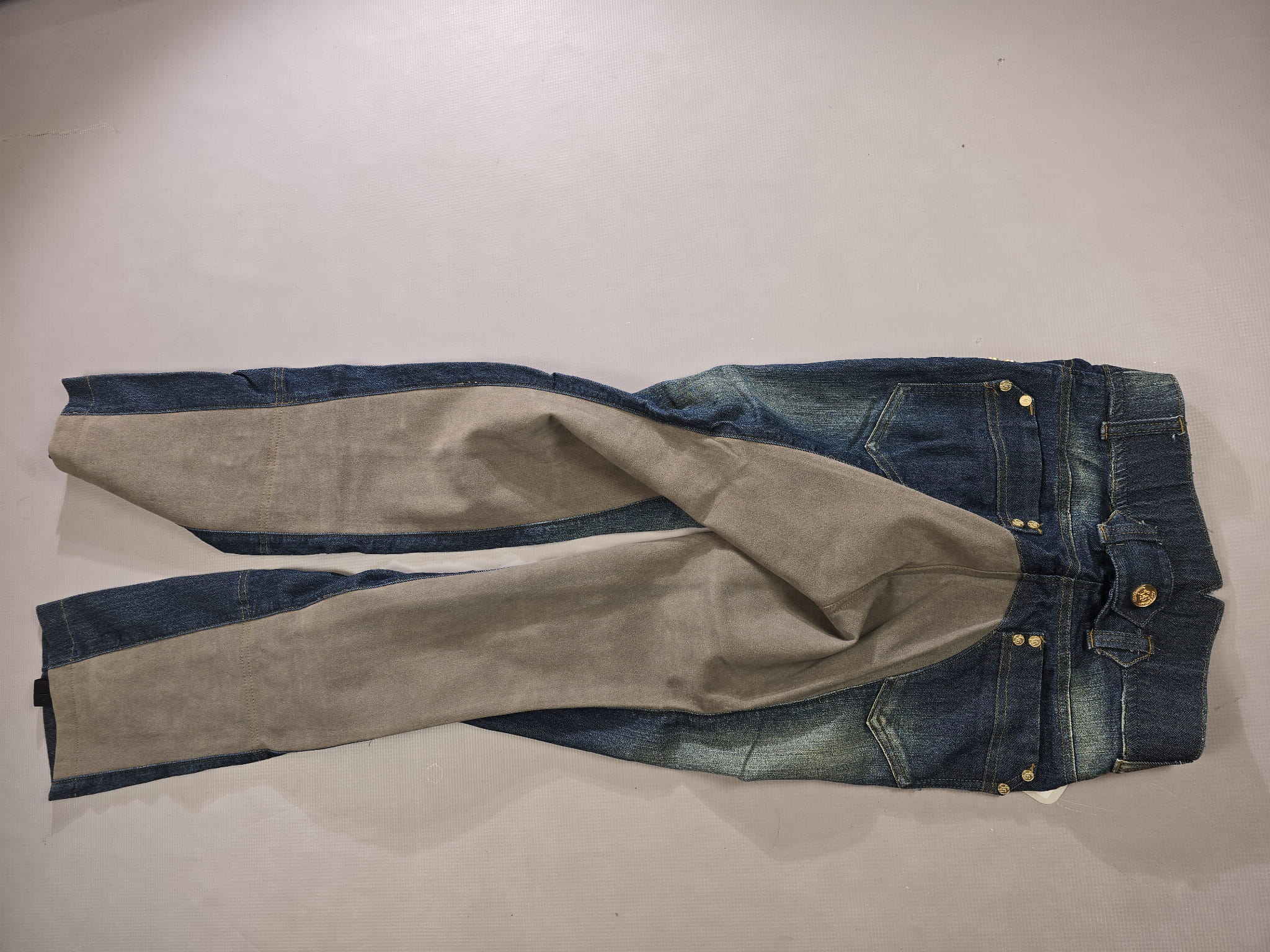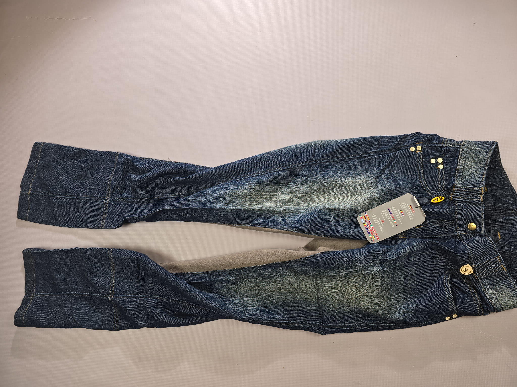 NOWE bryczesy jeansowe. Posiadają skórzany pełny lej.