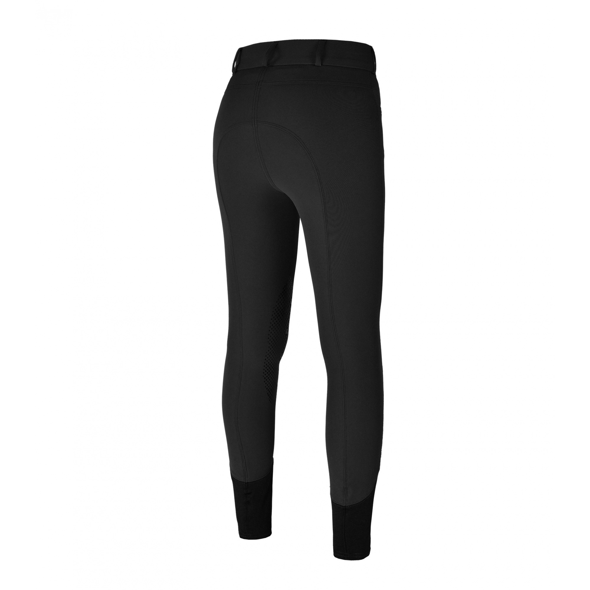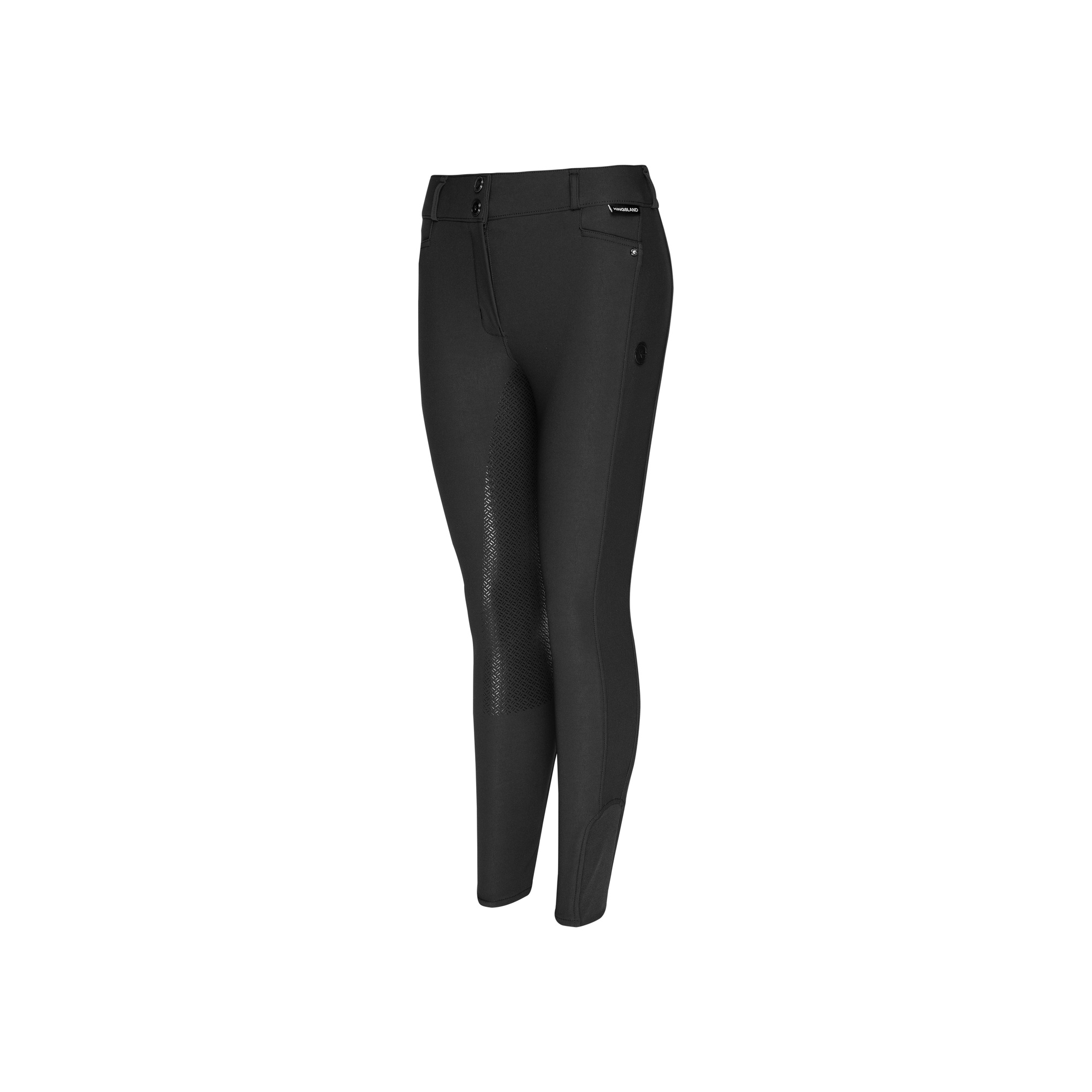 Damskie bryczesy z silikonowym lejem kolanowym. Wysoki stan, zapinane na dwa guziki. Wykonane z najwyższej jakości materiału elastycznego w czterech kierunkach. Wodoodporne, nie przyjmują brudu i kurzu, oddychające. Dla zapewnienia maksymalnego komfortu, nogawki wykończono lycrą. Bryczesy ozdobione napisem Kingsland przy lewej kieszeni i małą naszywką z logo.