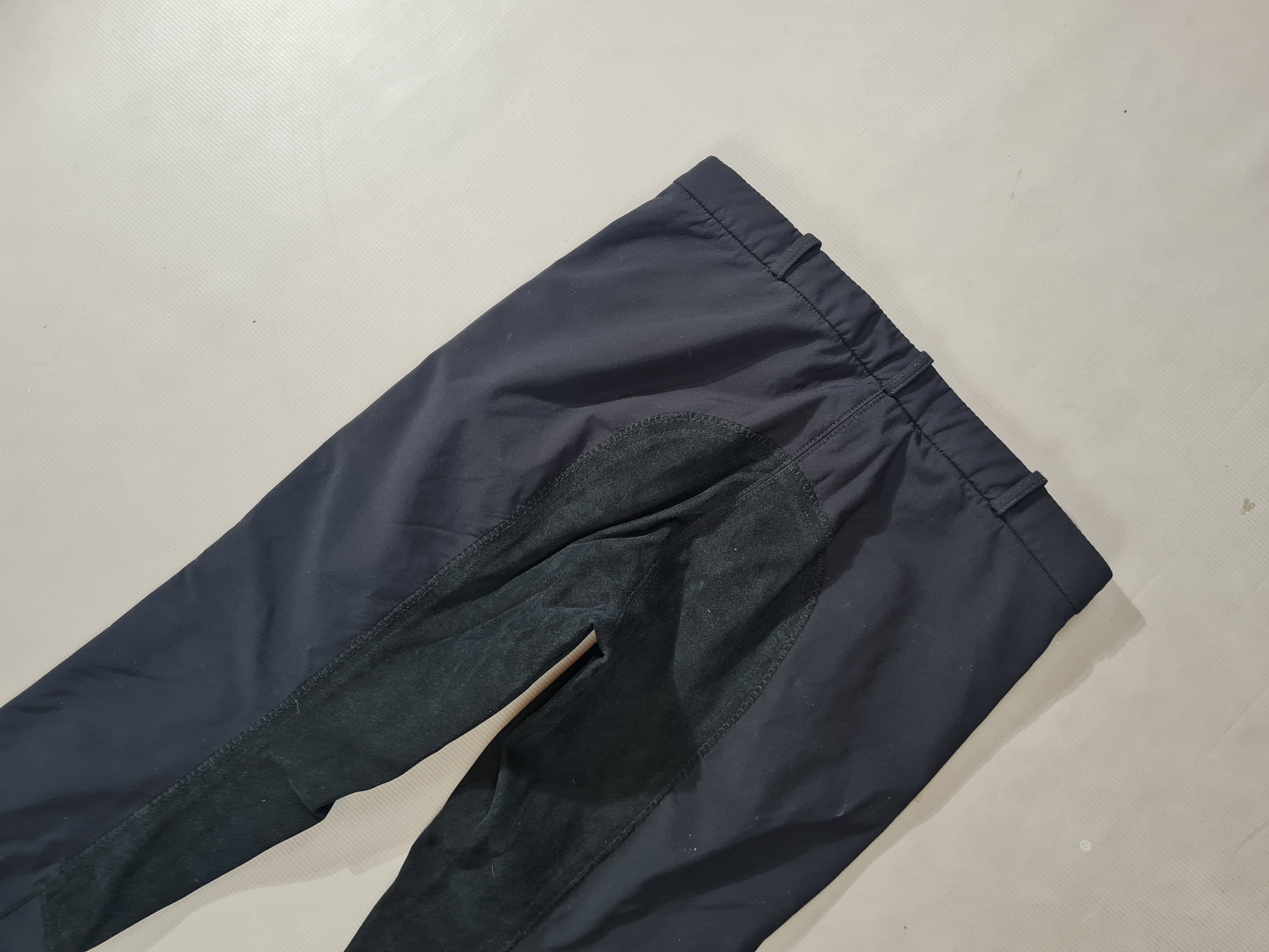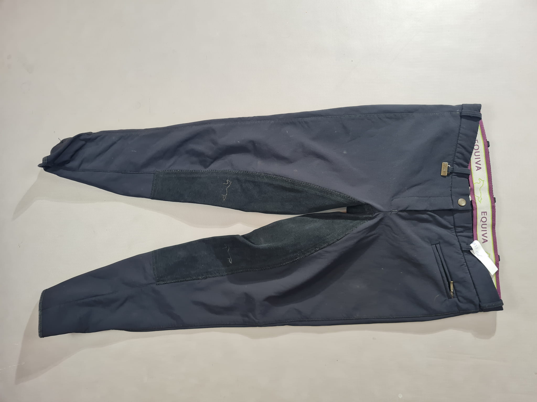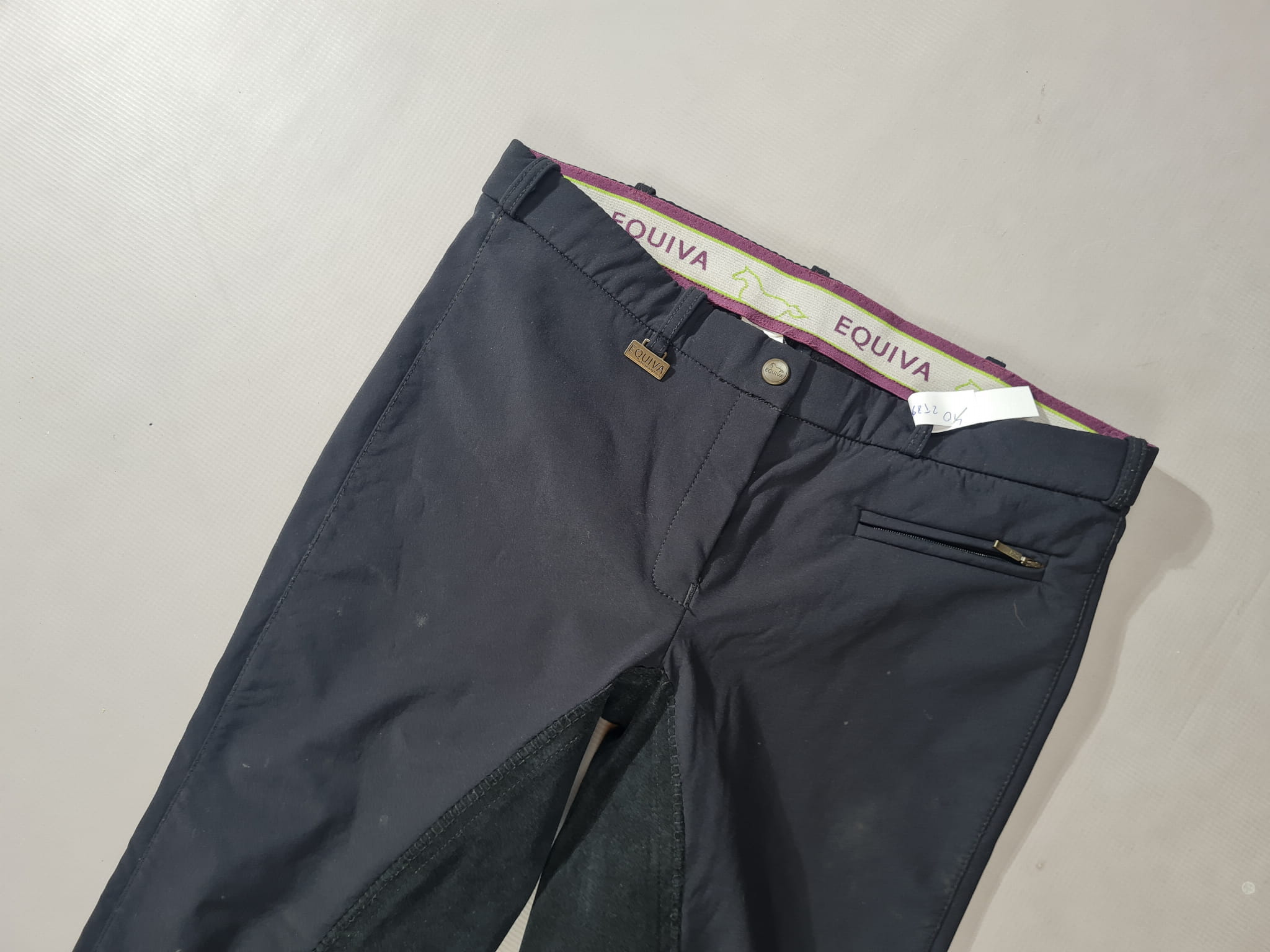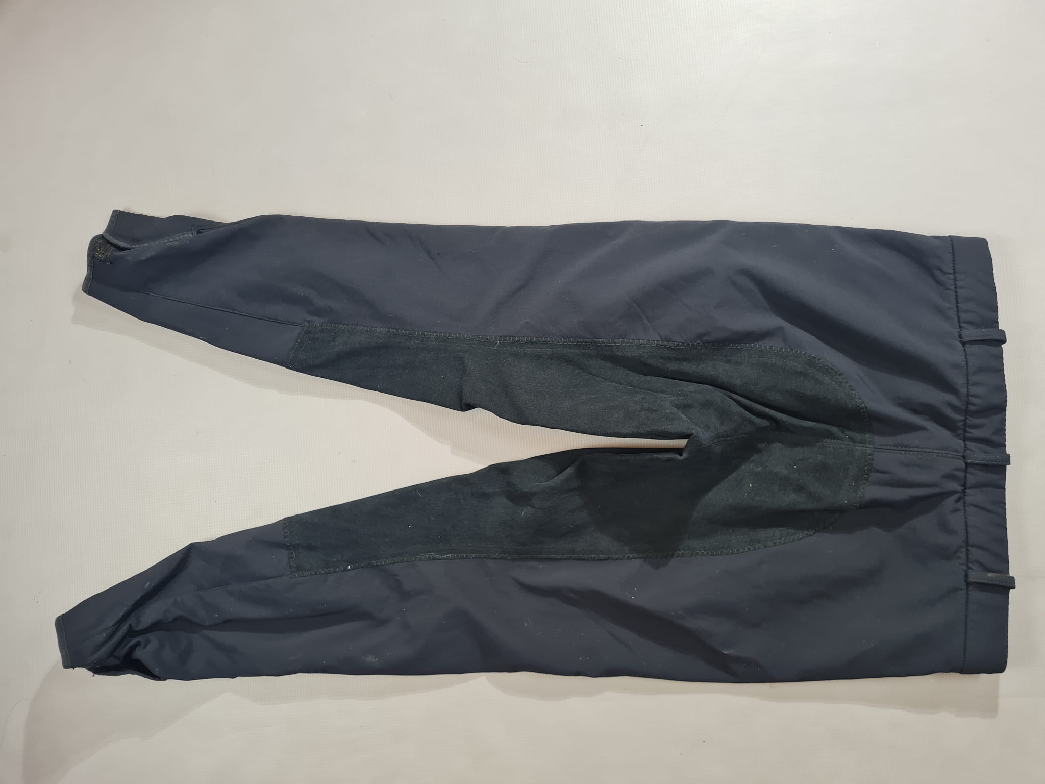 Używane bryczesy firmy Equiva koloru czarnego. Posiadają skórzany pełny lej. Wykonane z materiału typu softshell idealnego na zimę.
