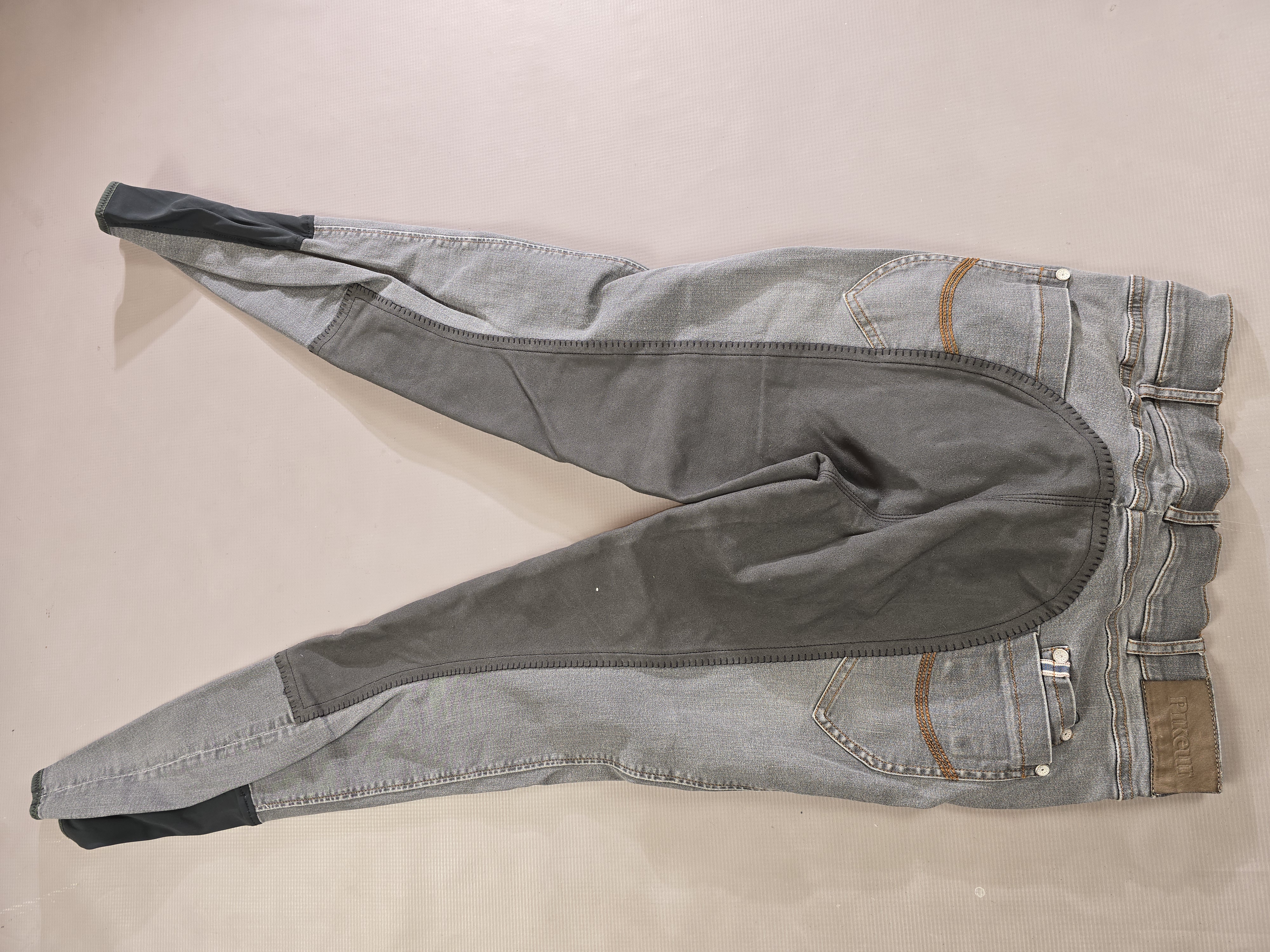 Używane bryczesy koloru szarego. Posiadają skórzany pełny lej.