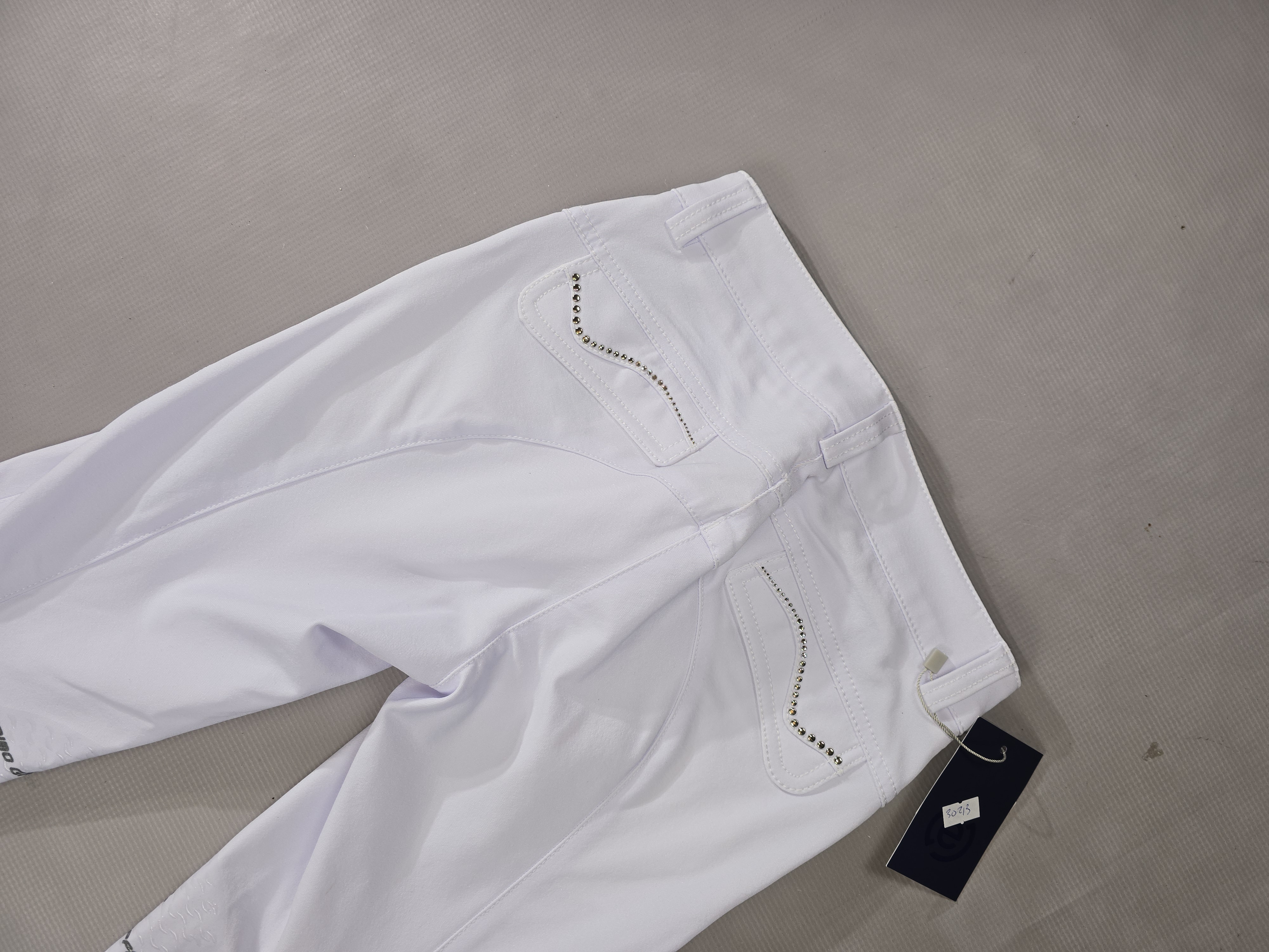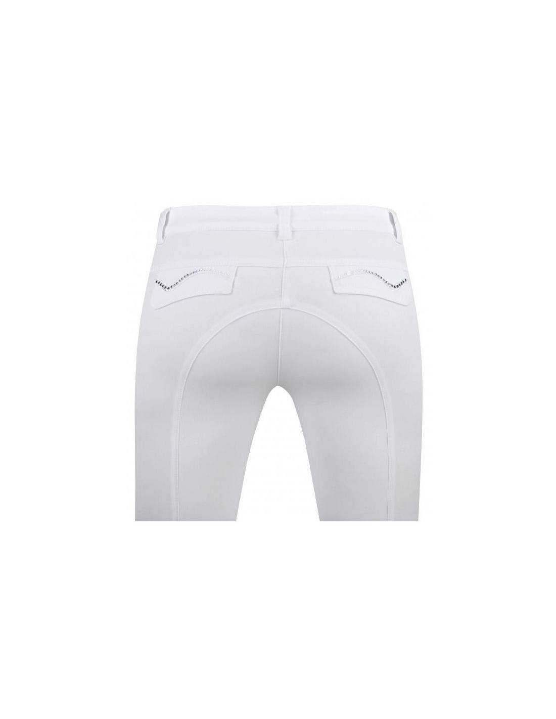 Na tylnych kieszeniach umieszczono ozdobne kryształki. Bryczesy wykonano z elastycznego i oddychającego materiału wysokiej jakości. Nogawki zostały wykończone elastycznymi ściągaczami, dzięki czemu bryczesy nie podwijają się. Model doskonale podkreśla sylwetkę.