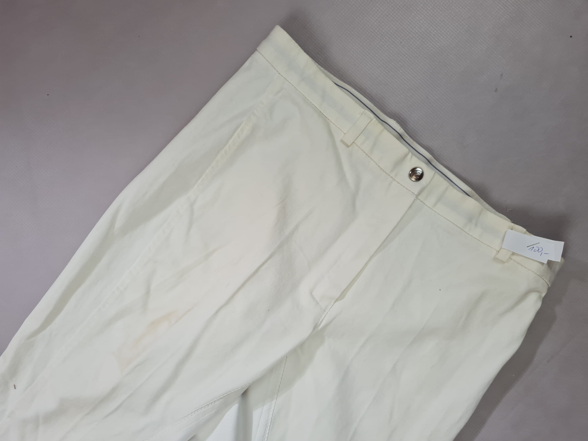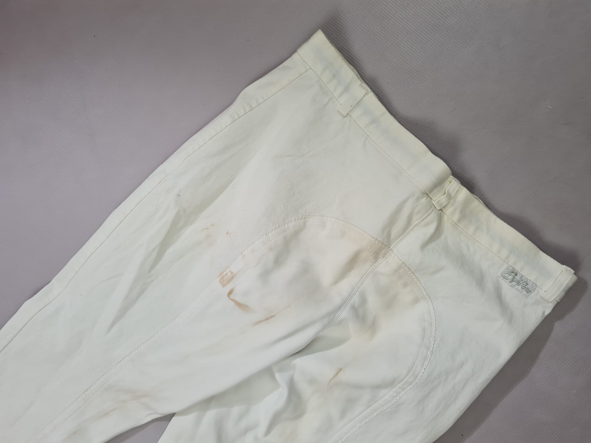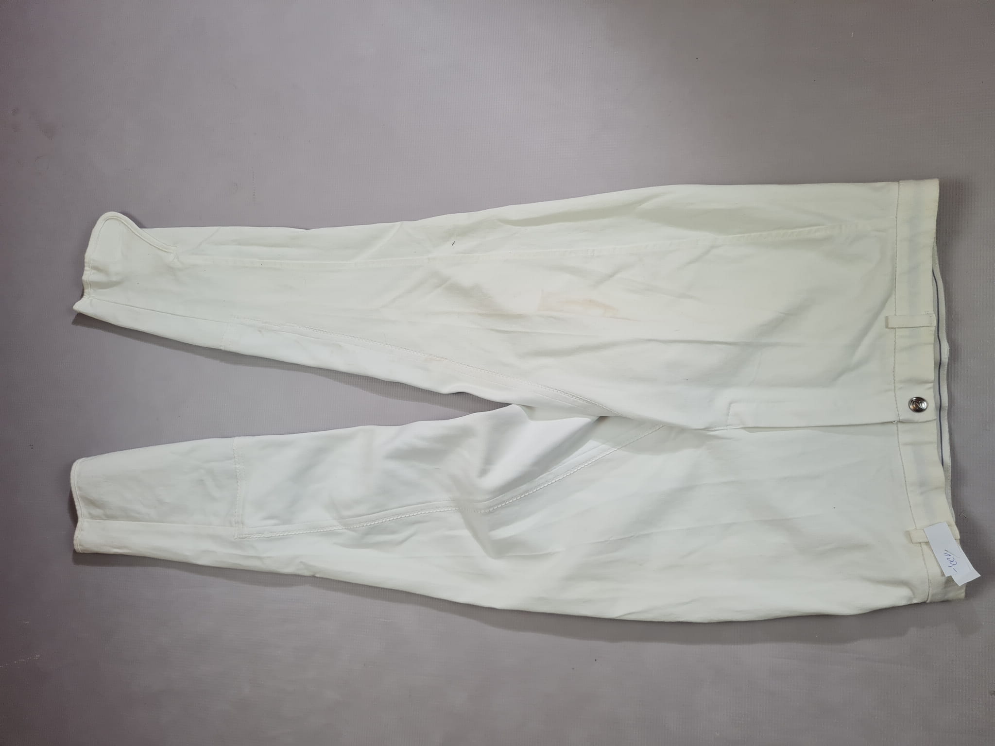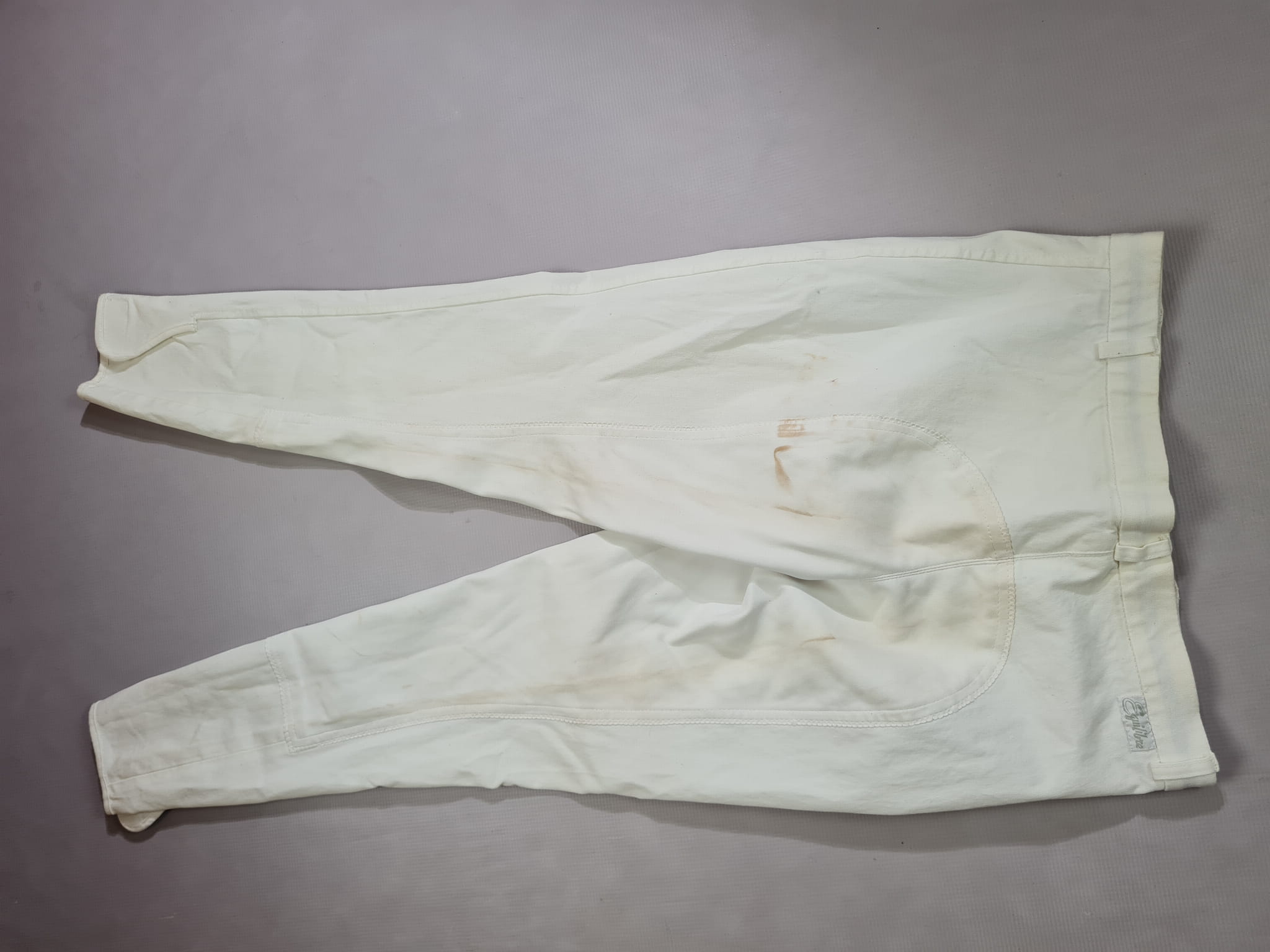 Używane bryczesy koloru białego. Posiadają skórzany pełny lej.