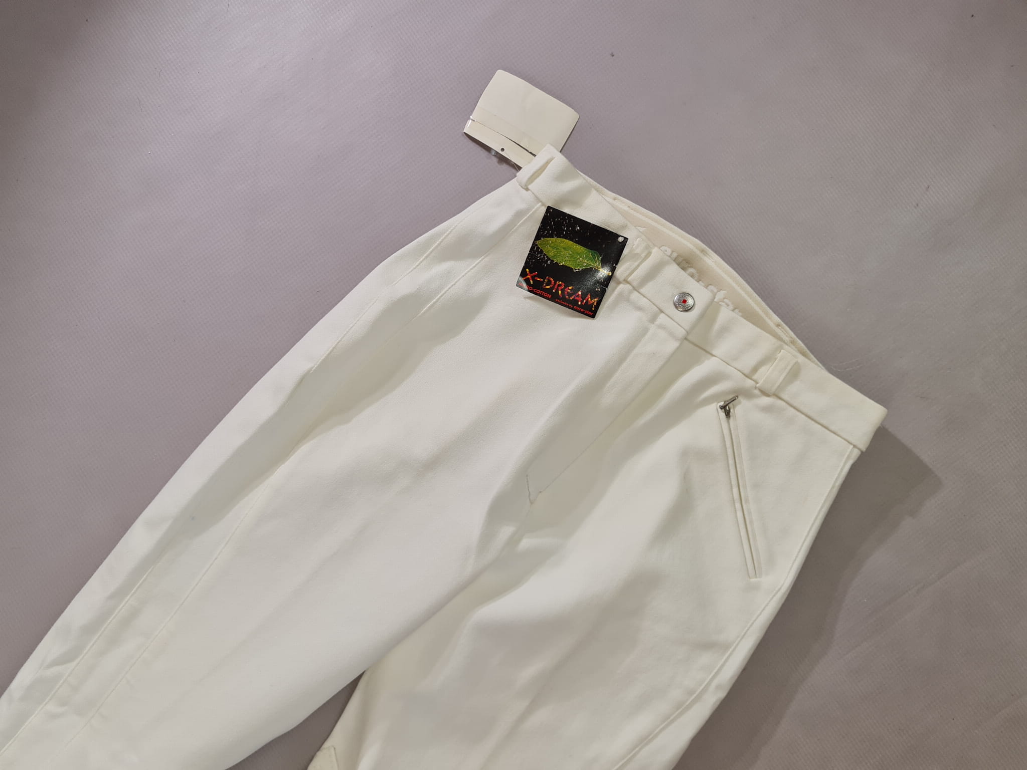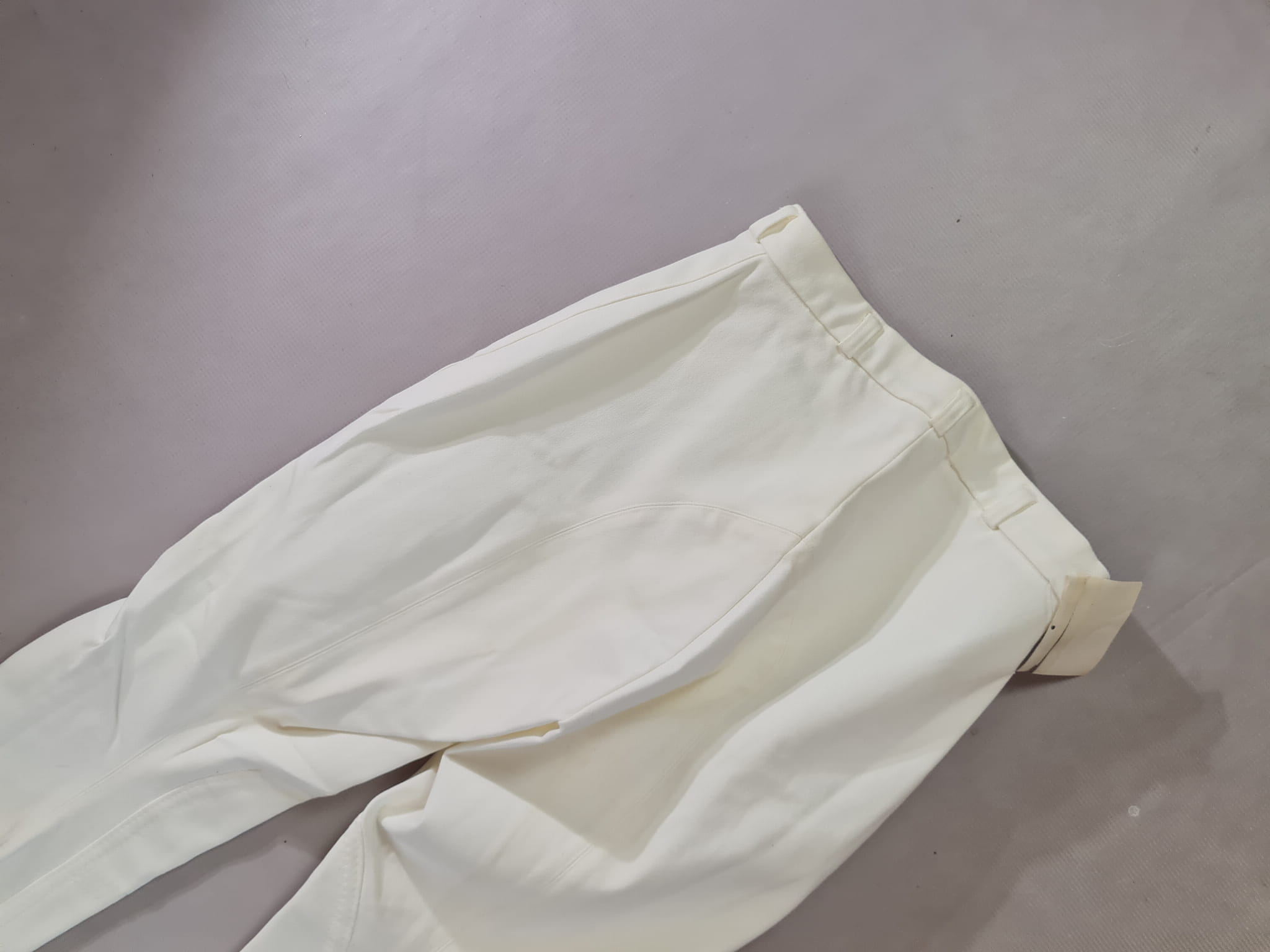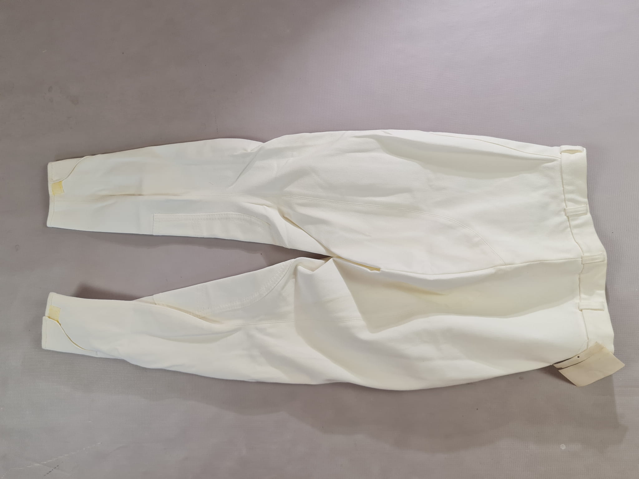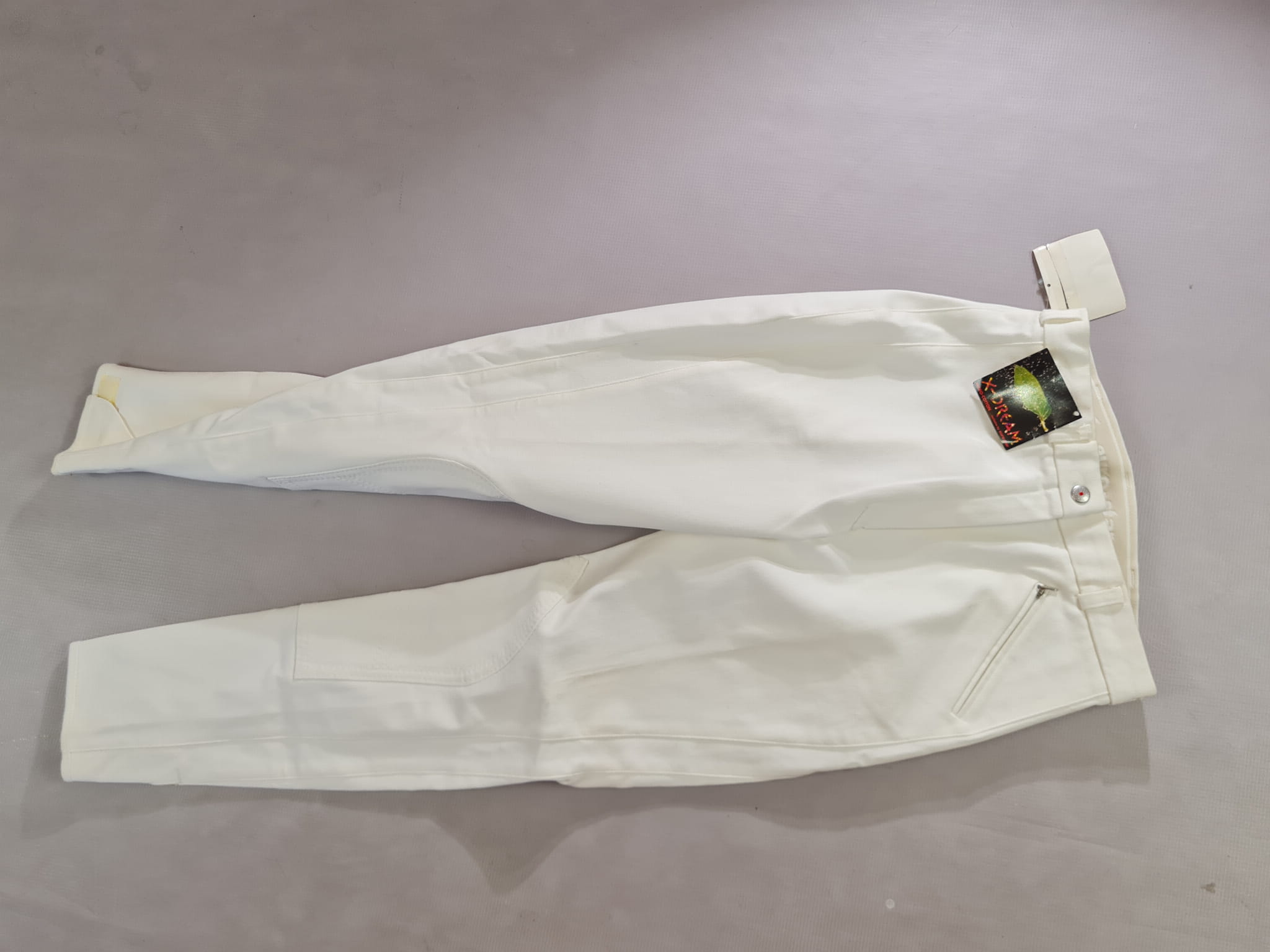 NOWE bryczesy koloru białego. Posiadają materiałowy krótki lej.
