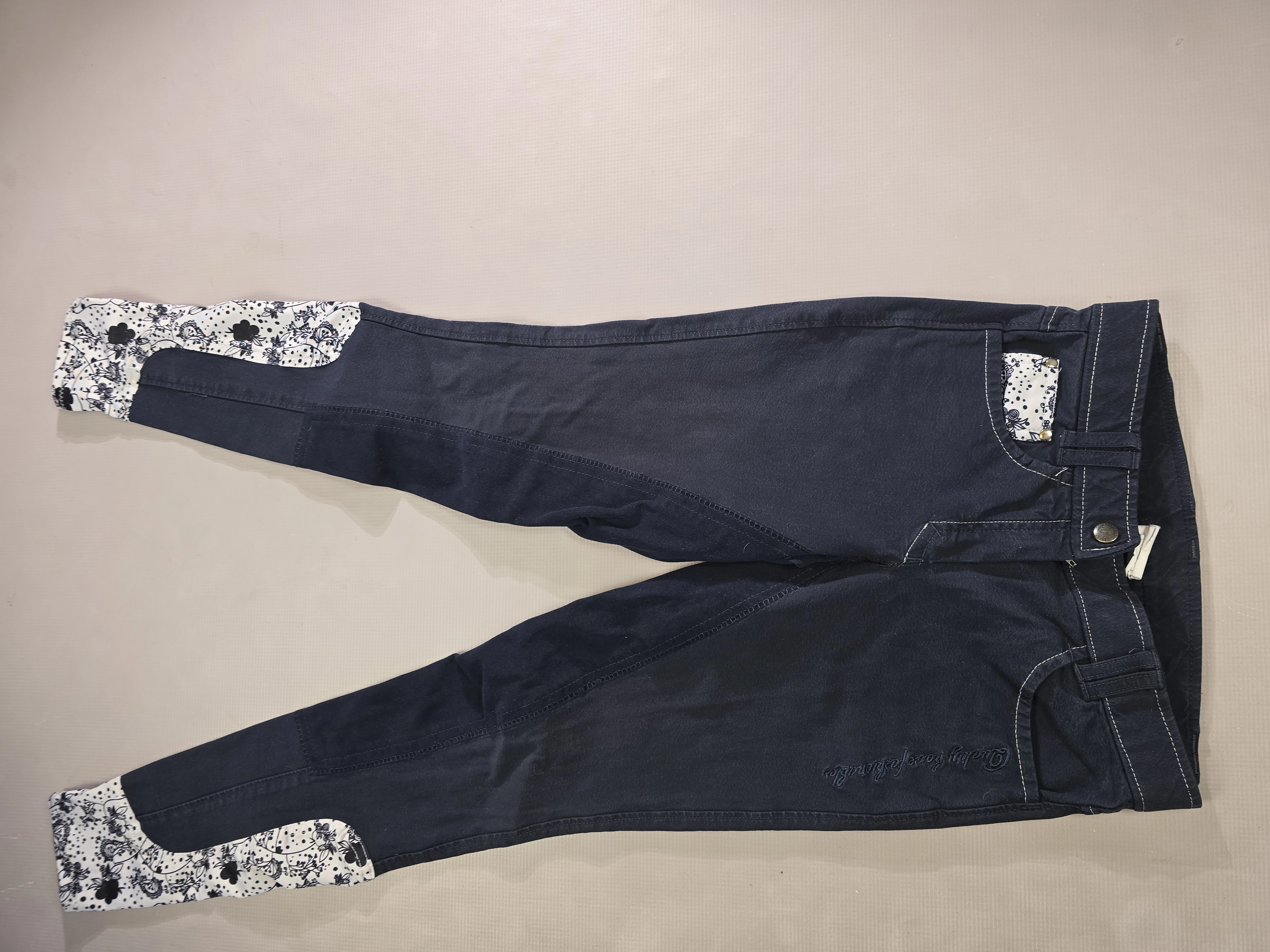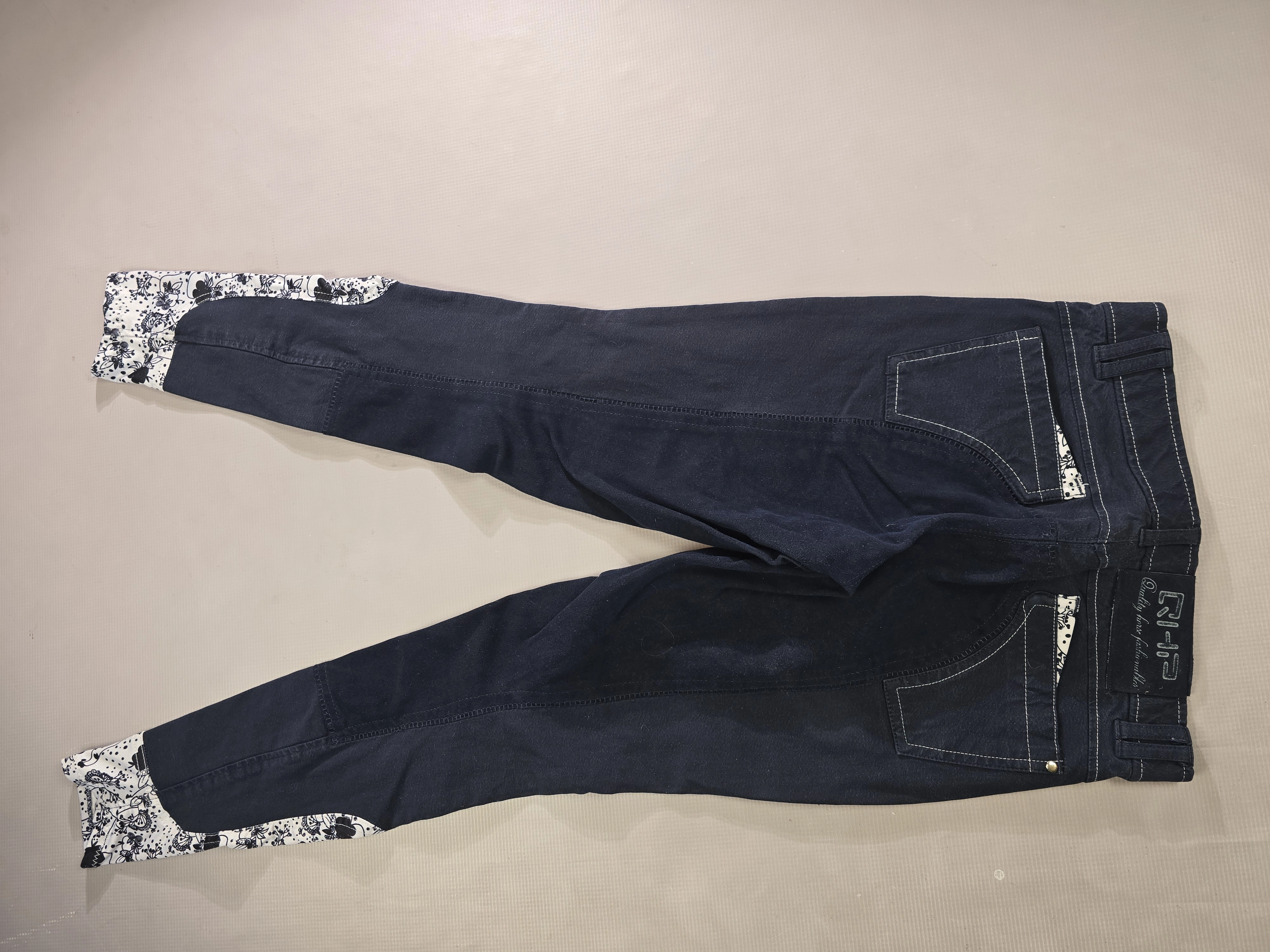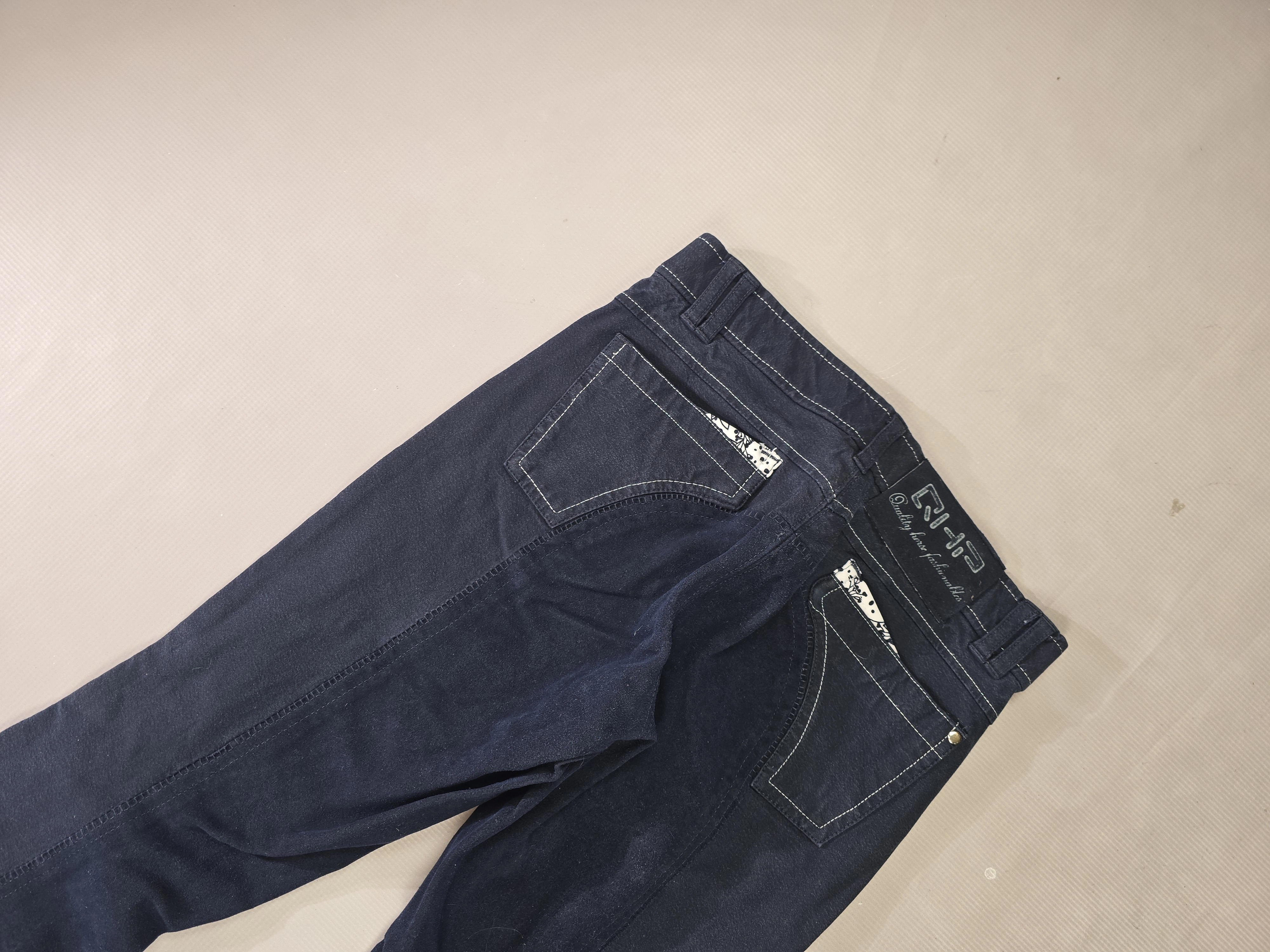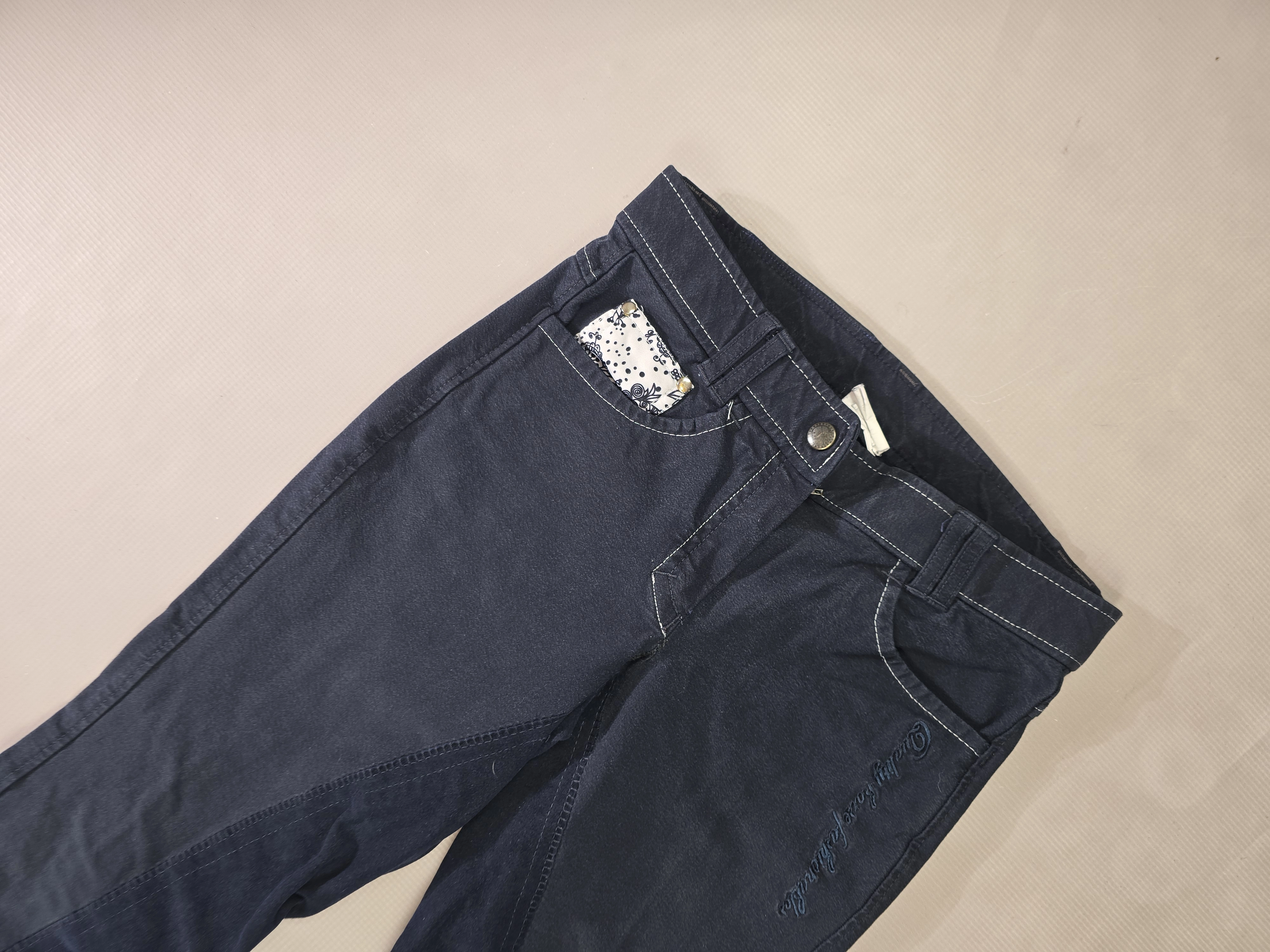 Używane bryczesy koloru granatowego. Posiadają skórzany pełny lej.