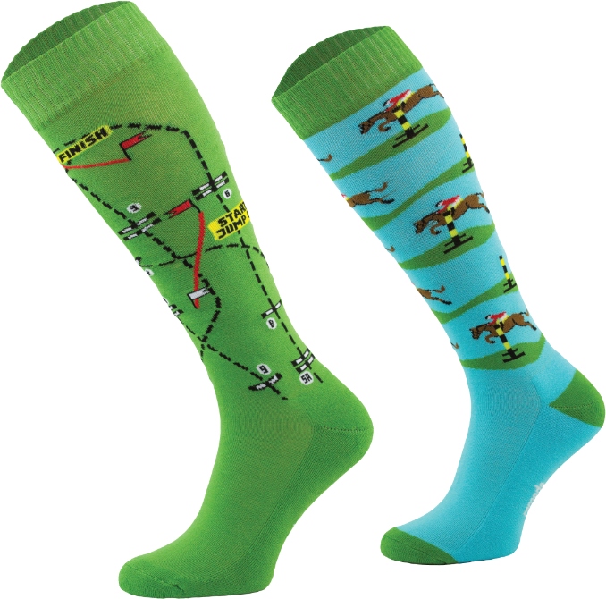 Jedna podkolanówka w skaczące konie, a druga w tor przeszkód